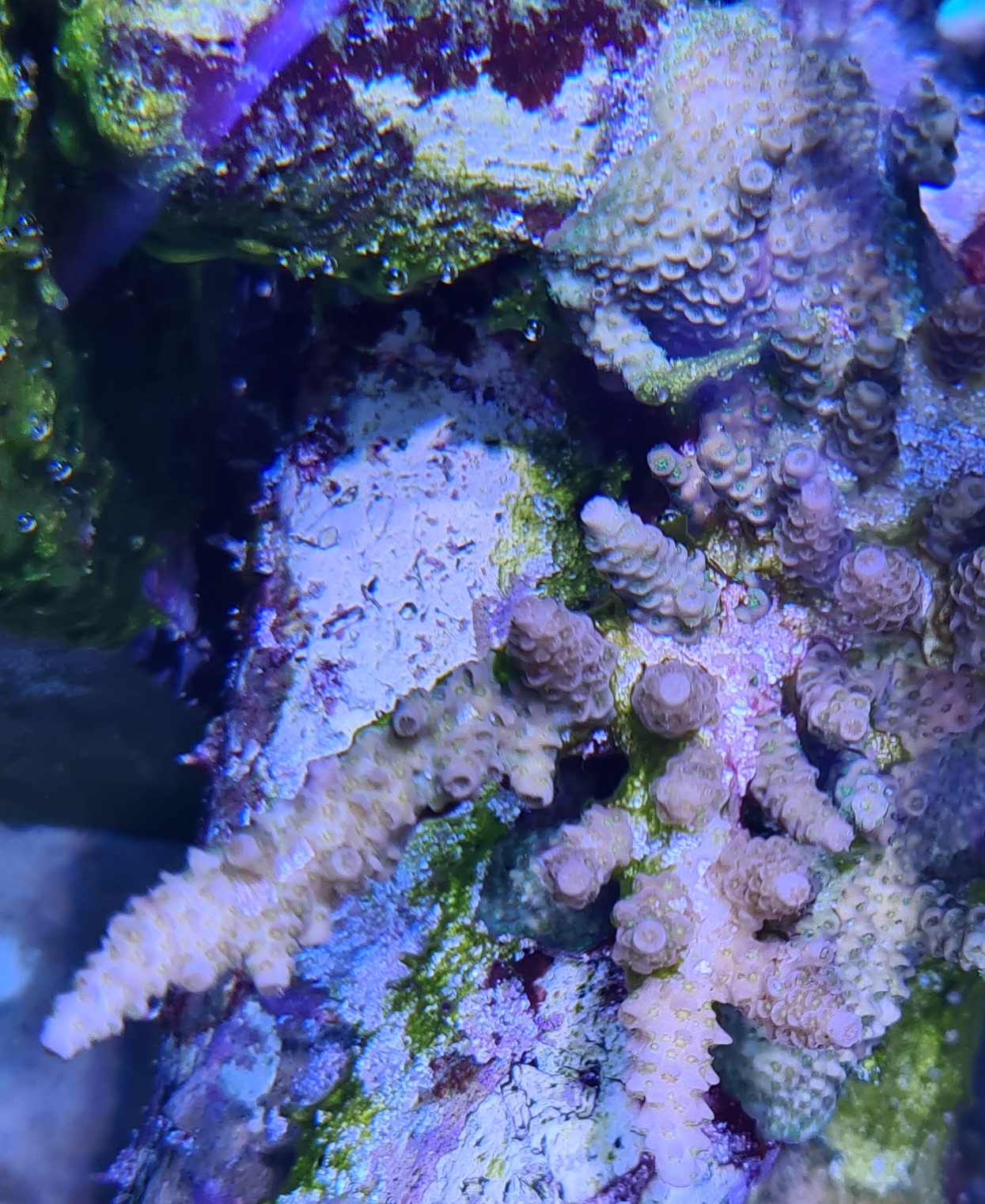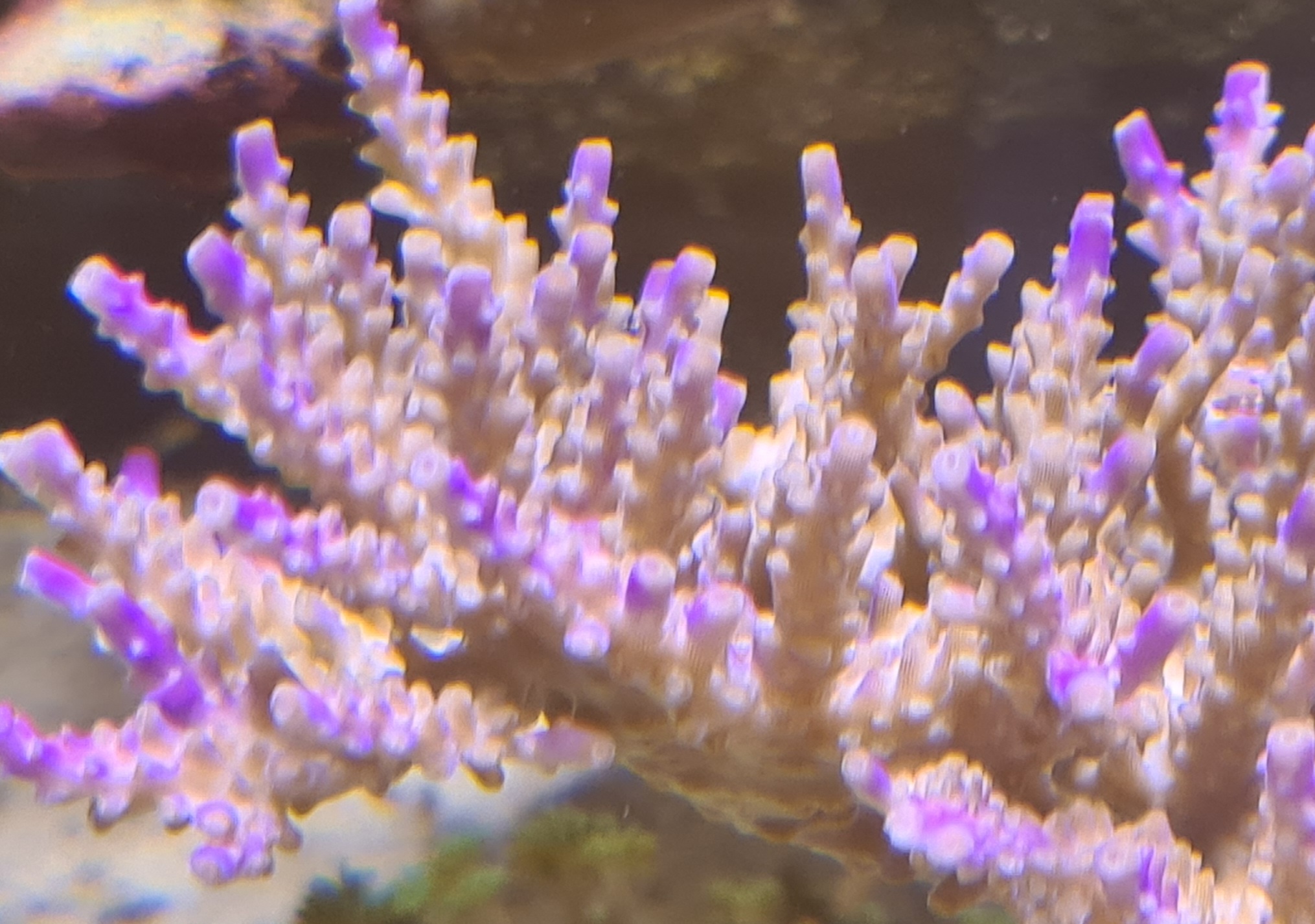 Also Gewebeverlust haben beide zum Glück noch nicht, der Farbunterschied bei der Hyacinthus liegt daran das die Basis Grün war bzw noch leicht ist und die Äste Rot und deswegen sieht es unten so als ob das Gewebe schon ab ist, ist es aber noch nicht. Zeigt sogar Polypen.