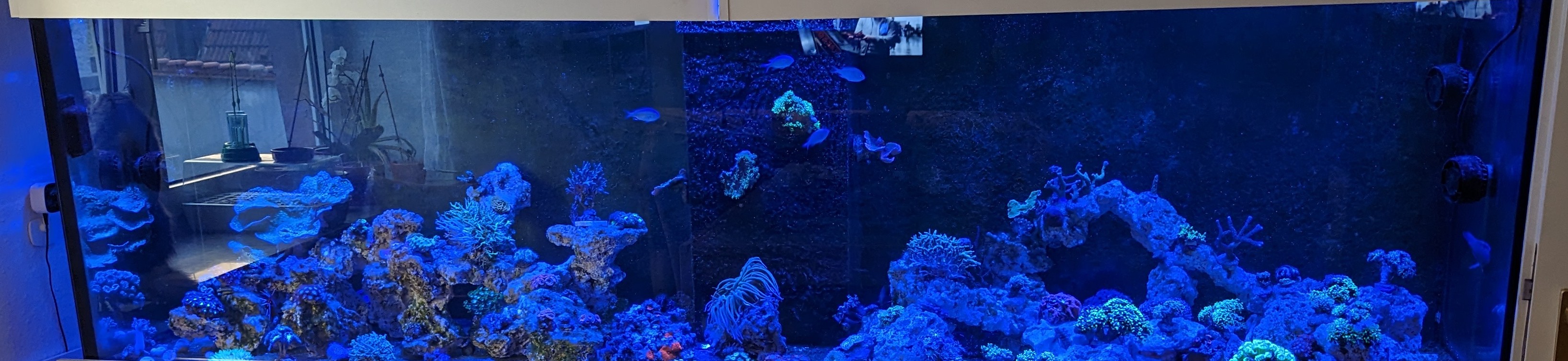 Ich habe die Maxspect RSX200 aktuell bei 80 Prozent. Habe vor 2 wochen eine PAR Messung durchgeführt und liege aktuell oben im Riff peak bei 170 und unten auf dem Boden so bei 100-110. Strahlungsstress würde ich mal ausschließen wollen. Weiß und blau sind bei gleichen Teilen. Sieht etwas blau aus denke ich weil die Handy Kameras ja immer zum blau neigen.