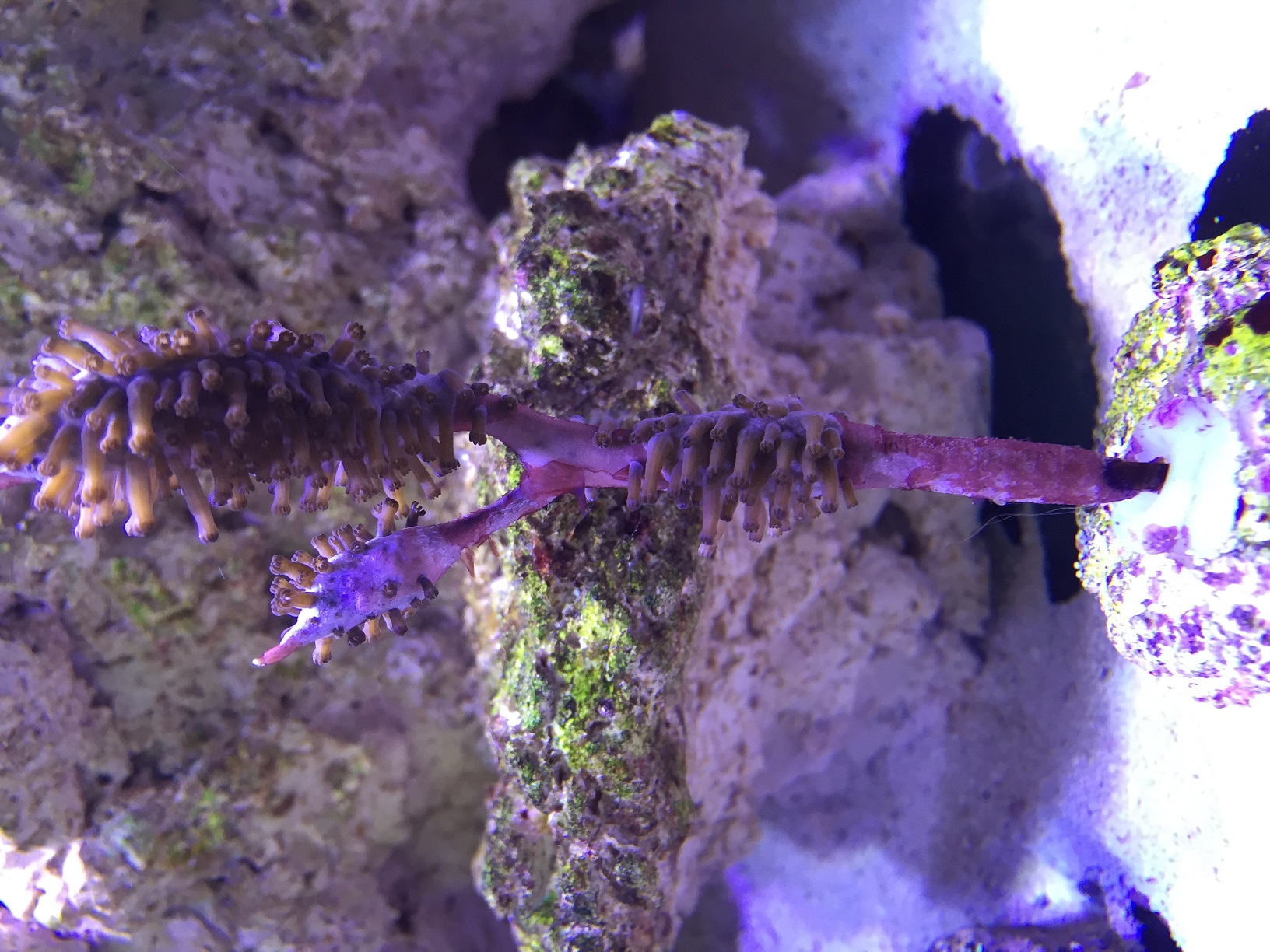 Obschon sich die Situation seit dem WW am Wochenende und der wiederinbetriebname des UV-Klärers gebessert hat sind die beiden Korallen immer noch mit einem nur sehr schwer entfernbaren Belag überzogen.