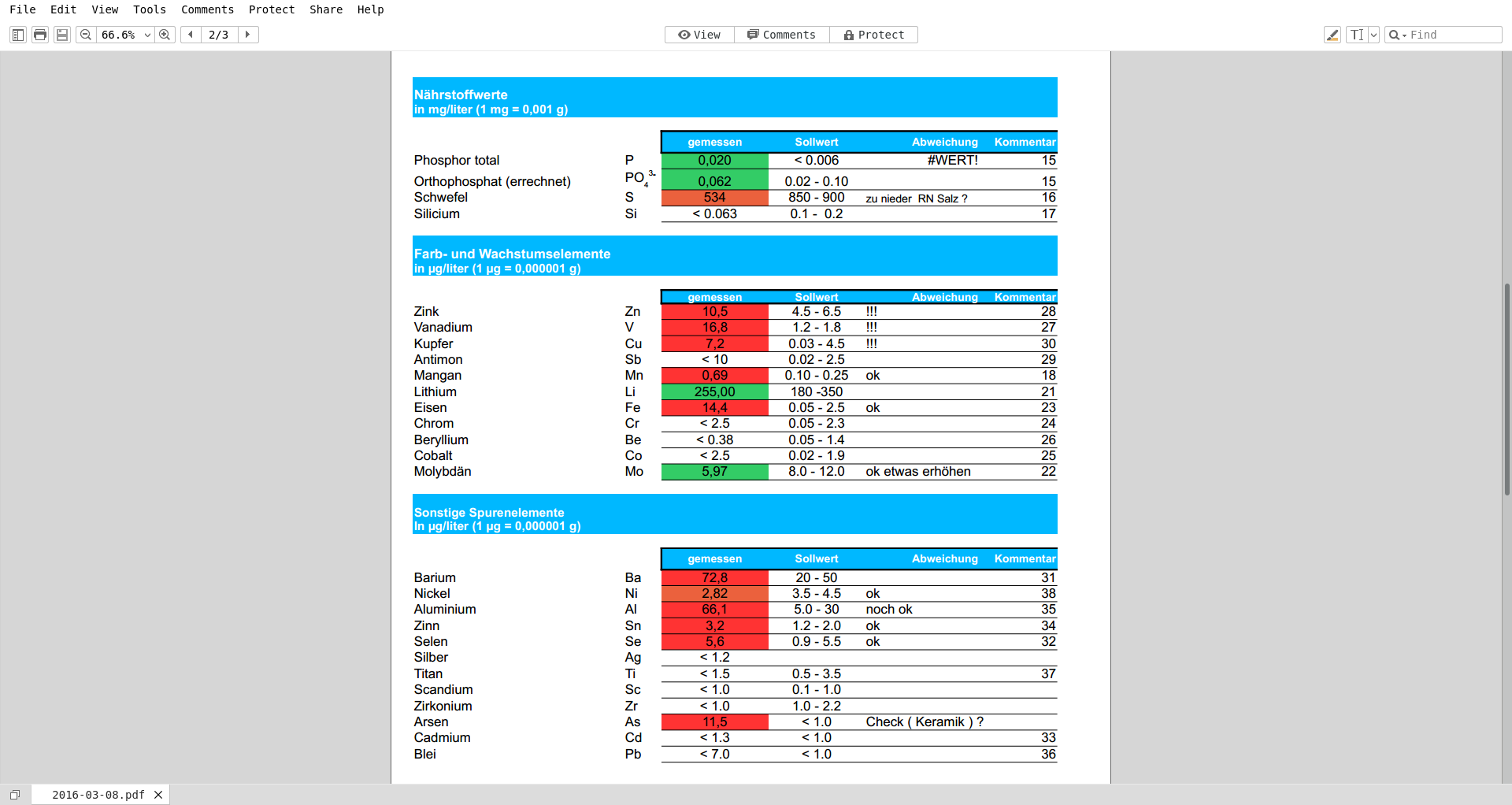 Meine Mail ging am 28.05. um 09:37 Uhr an dich raus. Aber egal, ich hänge mal schnell meine vorherige Analyse an diesen Thread ran; geht genau so gut. Damals hatte ich noch Rückschlagventile von Aqua Medic an meiner Dosieranlage. Diese haben innen jedoch zum Rosten angefangen, was man auch auf der Analyse gut sehen kann (Eisen, Zink, Kupfer usw.). Ich habe damals diese sofort gegen welche aus Silikon ausgetauscht und man sieht deutlich auf der neuen Analyse wie die Werte nun schön gesunken sind.