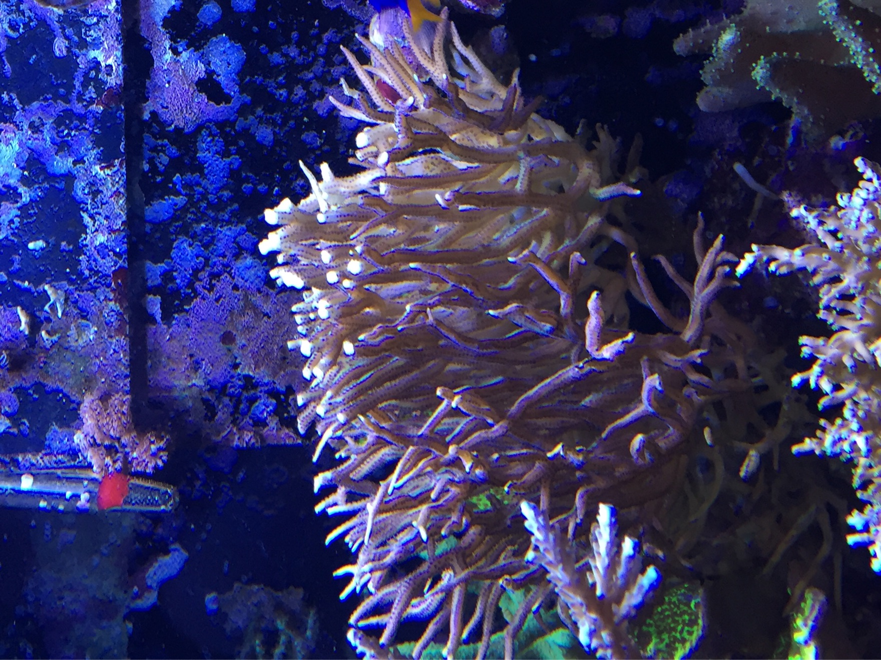 Daneben sitzt noch eine Montipora confusa die durch die Abschattung teilweise ganz hell geworden ist. Die ist nach Entfernung der Xenien innerhalb von eine paar Tagen wieder vollkommen durchgefärbt.
