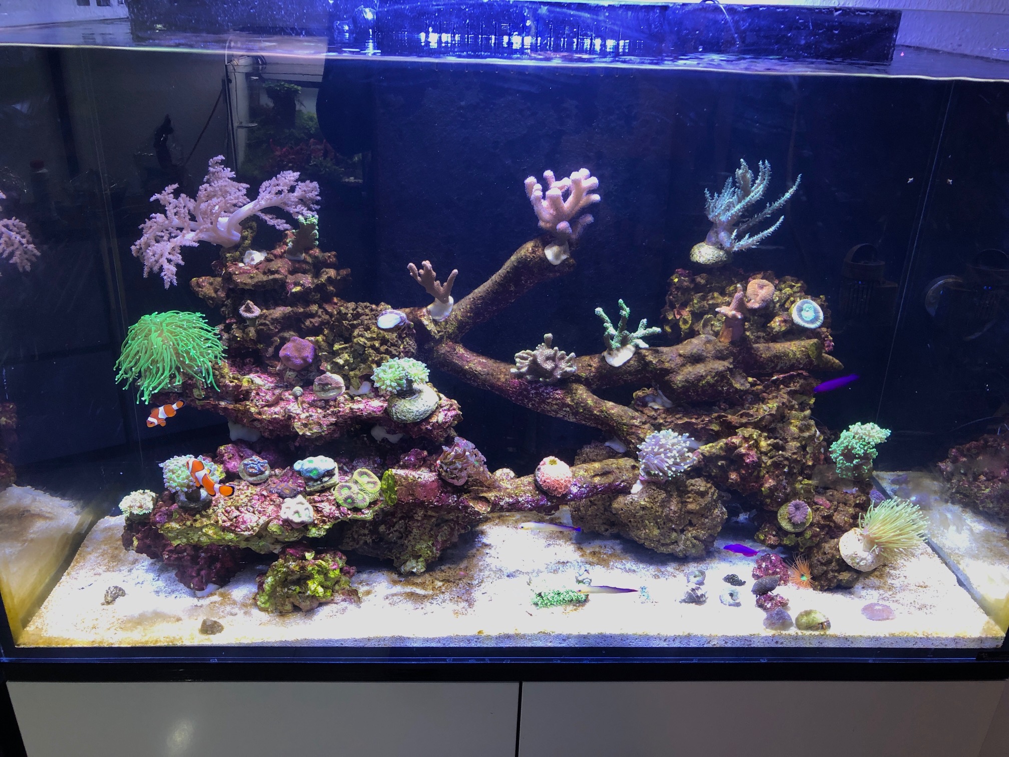Ich hab irgendwie keine Ahnung ob das zu viel oder zu wenig Licht ist. Jeder sagt mir eine Mitras auf dem Modus wäre viel zu wenig, aber ich habe das Gefühl durch die Algen, (eher blasse Milka welche ziemlich oben und mittig steht) und generell eher helleren Korallen, es wäre zu viel.