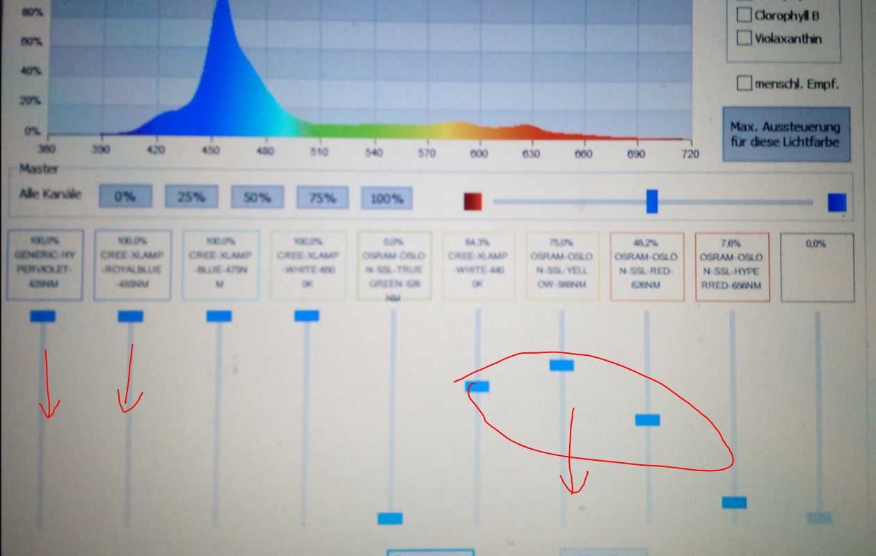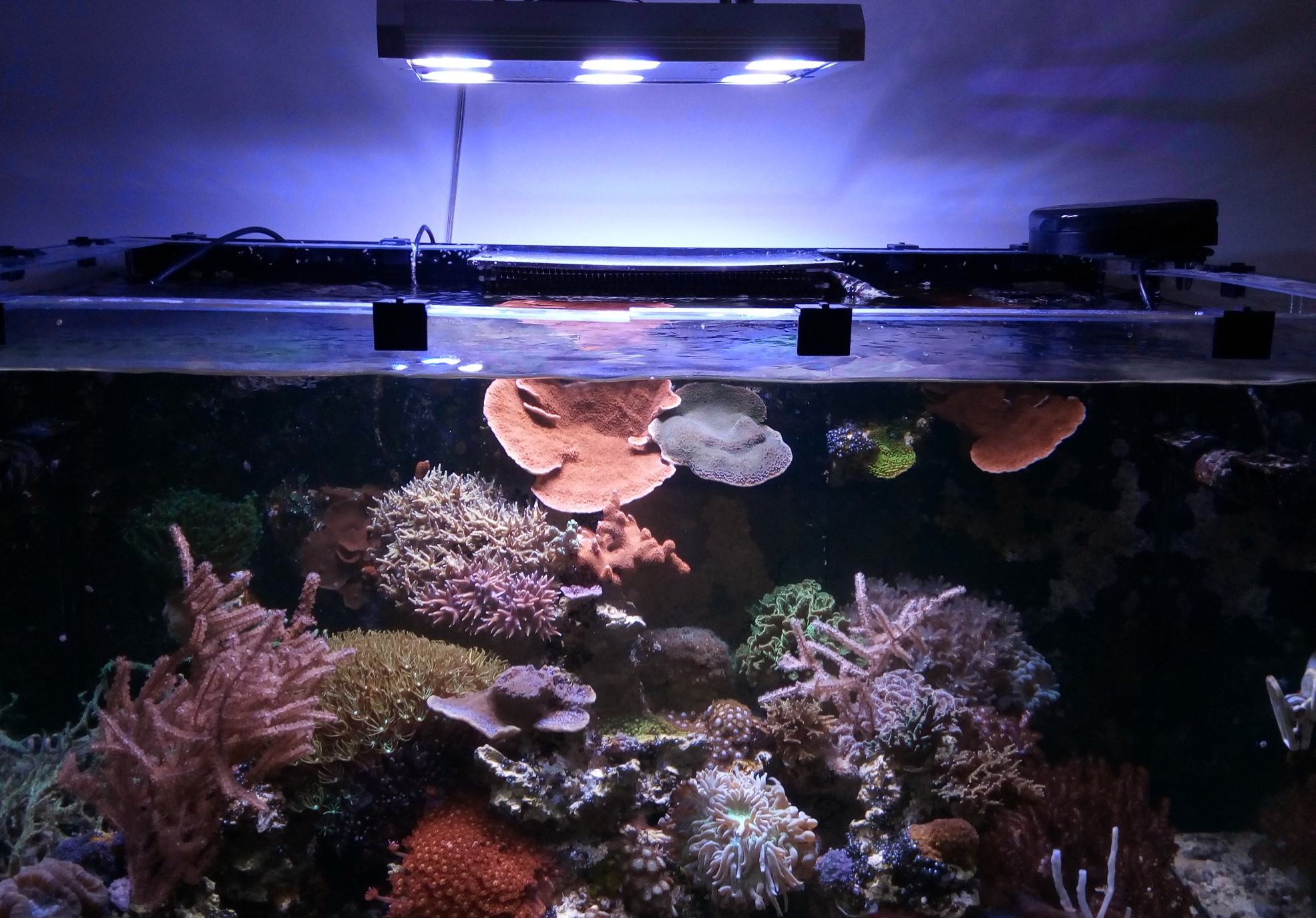 Für die meisten LED Lampen ist es als allgemeine Empfehlung sinnvoll, den weißen und den langwelligen blauen LED-Anteil (460-480 nm) in etwa gleich hoch zu betreiben, und den royal blauen LED-Anteil 15-20% niedriger einzustellen, weil genau dieser Wellenlängenbereich energiereicher ist und in hoher Intensität v.a. bei punktueller Beleuchtung potentiell Strahlungsstress erzeugen kann, und zudem die weißen LEDs bereits eine Royalblau-Emission aufweisen. Kaltweiße LEDs basieren in der Herstellung auf einer Royalblau-LED und zeigen daher typischerweise bei ca. 450 nm baubedingt eine signifikante Strahlungsemission, weshalb der Anteil royal blauer LEDs in Relation zu den blauen LEDs in der Gesamtkonfiguration auch geringer ausfallen sollte. Die royal blauen LEDs sollten nicht höher geregelt sein als die normal blauen LEDs, weil die Zooxanthellen durch ihre Chlorophyll-Peridinin-Kopplung in den Photosystemen eher im langwelligen Blau absorbieren. Für Einsteiger und LED-unerfahrene Anwender gilt die Empfehlung, bei violetten/“UV“ LEDs nur circa 10-20% der individuell möglichen Lampenleistung zu nutzen, um Strahlungsstresszustände in Korallen zu verhindern.