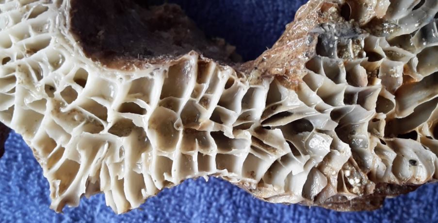 ..und hier noch ein sehr schönes Bild vom Querschnitt des Korallenskelettes. Durch die Querverstrebungen wird das Kalkskelett äußerst stabil. In der Natur sind es riesen Kolonien, welche ohne diese Verstrebungen im Fussbereich zusammenbrechen würden.