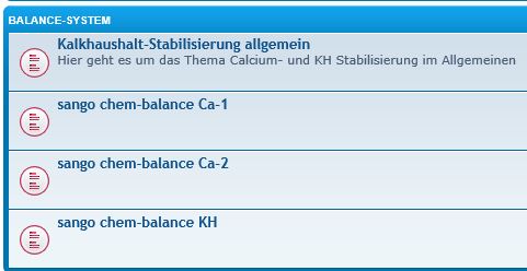Hallo, das BALANCE-System umfasst zwei Produktbereiche: die sango chem-balance Produkte zur Kalkhaushalt-Stabilisierung, sowie die sango chem-individual Produkte zur individuellen Dosierung von Meerwasserinhaltsstoffen.