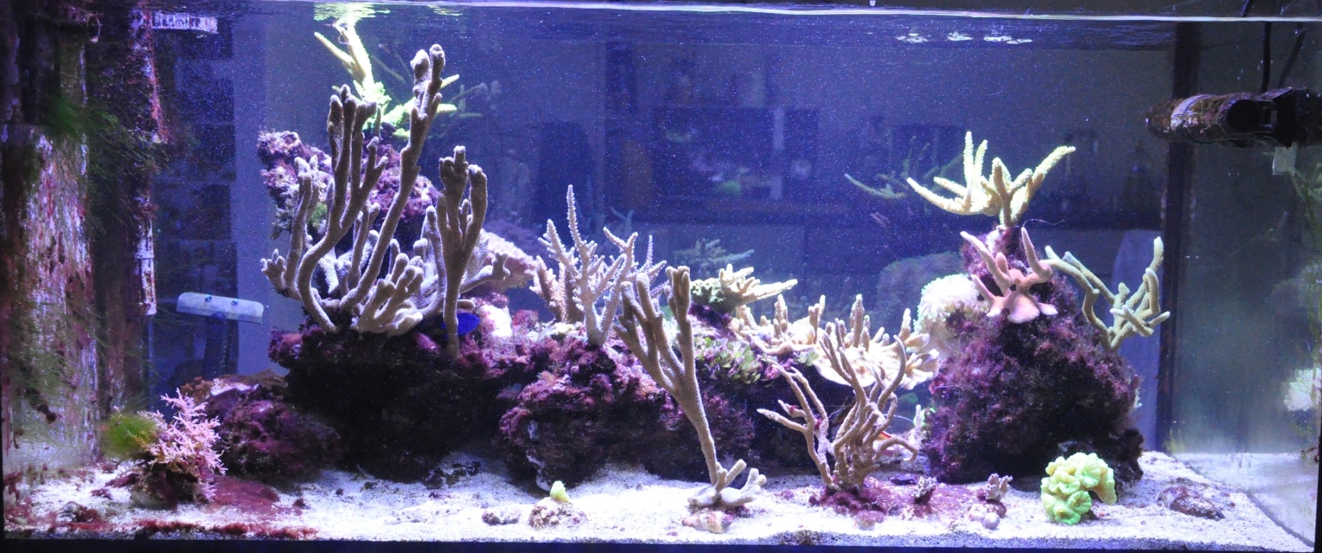 Neu habe ich mir vor etwa einem Monat zwei Strombus-Schnecken zugelegt, welche sehr zuverlässig den Bodengrund von den schleimigen Cyanos befreit haben. Wie auf den Bildern zu erkennen, kämpfe ich aber immernoch mit den thallösen Cyanos auf dem Riff. Diese wollen einfach nicht verschwinden. Die gehören mittlerweile einfach dazu. Der neue Abschäumer konnte ich aber jetzt viel besser einstellen und einen richtig trockenen Schaum einstellen. Genau genommen schäumt er kaum noch etwas ab. Ich hatte innerhalb eines Monats nur ca. 75mL abgeschäumtes Material im Topf. Die Nährstoffe sind jedoch immernoch nicht wirklich nachweisbar.