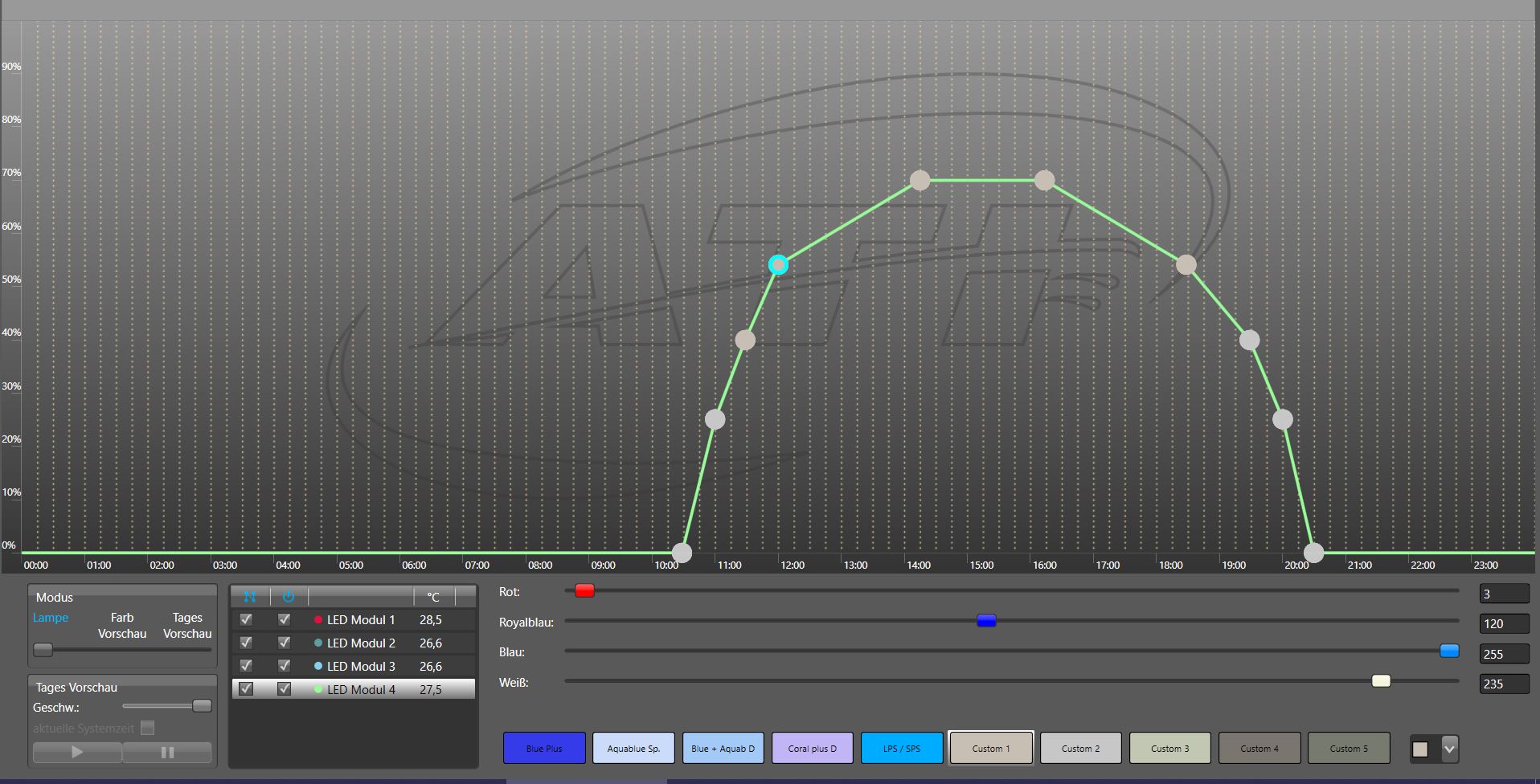 Hecke71 hat geschrieben:Wegen den Einstellungen der ATI Lampen: Meinst du ich soll mit den Punkten eher so eine Gauss Kurve bauen ? Dachte ich hätte gehört / gelesen man soll zügig zu den Werten kommen und nicht Kurven einbauen, weil sich dann die Korallen im Tagesverlauf immer wieder anpassen müssen.