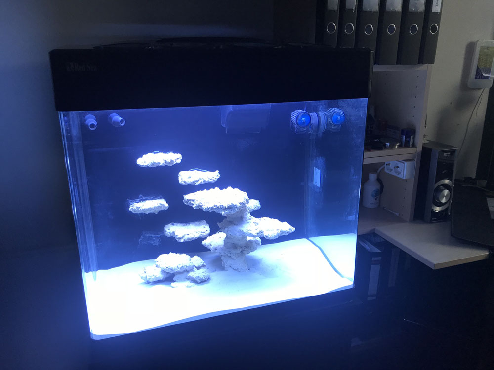 So nun wie gesagt habe ich vor 14 Tagen gestartet. Zuvor noch mit Fauna Marin Pro Salz aufgesalzenenes Osmosewasser gefüllt, Riffkeramik rein, und Red Sea Life Sand rein.