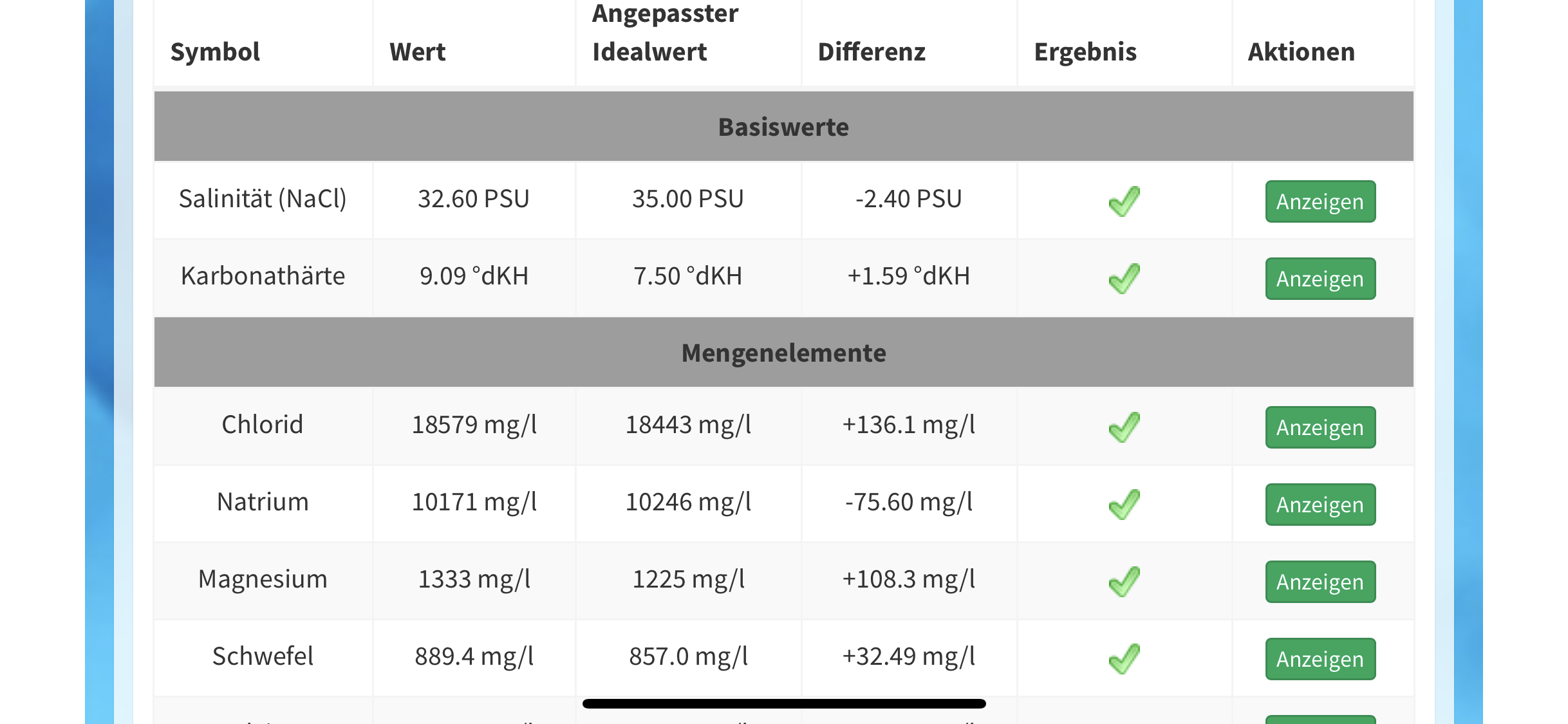 Deine Hauptelemente sind in Relation zu der niedrigen Salinität (32psu) recht hoch. Wie oft hast Du in der letzten Zeit Wasserwechsel gemacht; da stimmt was mit dem Salz nicht.