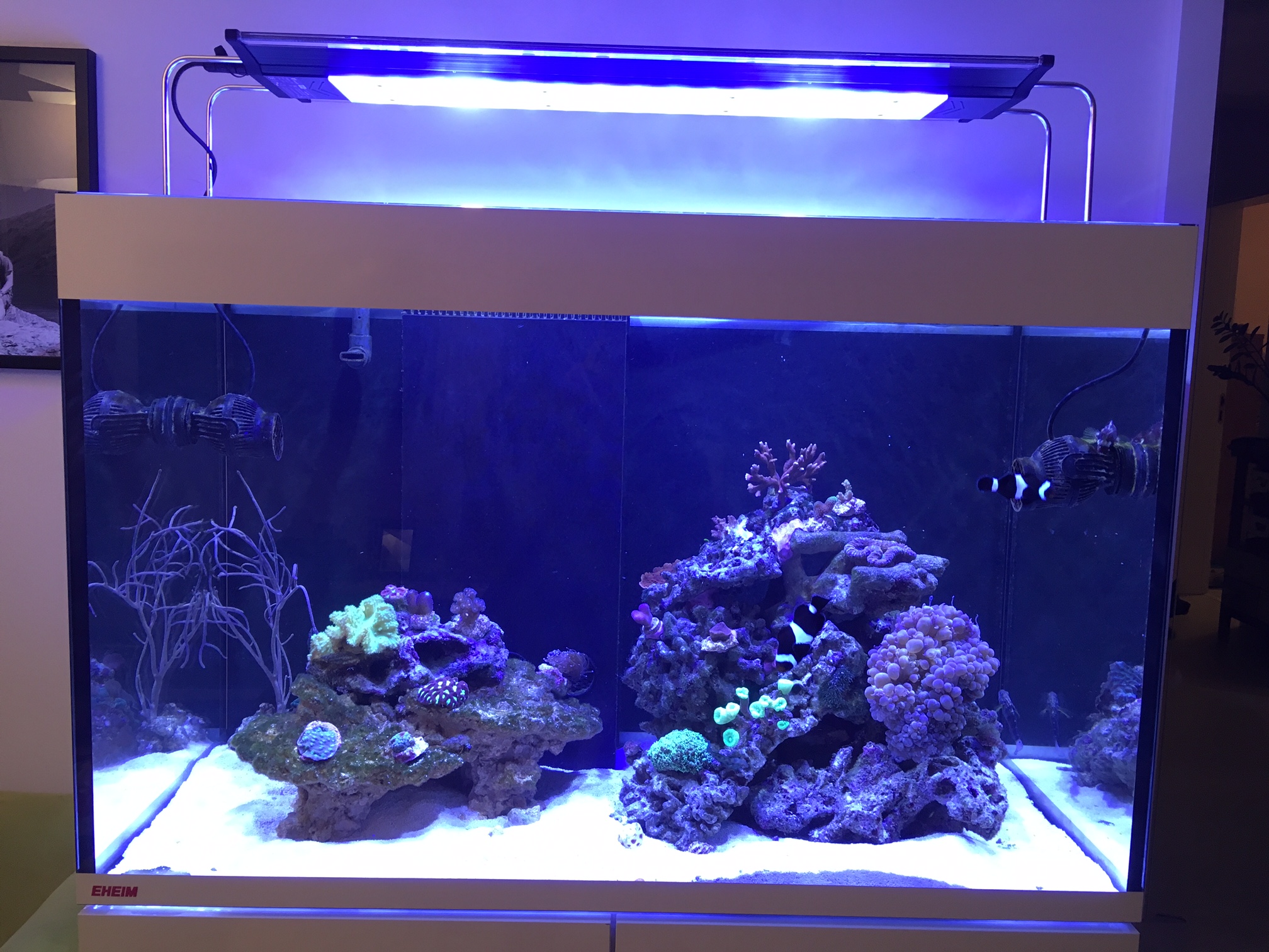 Ich heiße Tom, bin 35 Jahre alt und wohne mit meiner Familie in Luxemburg an der Mosel. Seit 2012 betreibe ich ein Meerwasseraquarium. Dies war ein AquaMedic Gramma, welches ausschließlich mit Weichkorallen bestückt war. Nitrat und Phosphatwerte waren jenseits von Gut und Böse, doch es lief. (Nitrat nie unter 30, Phosphat um 1) Das Aquarium gefiel mir so aber nicht und im Februar diesen Jahres konnte ich endlich vergrößern. Es wurde ein Eheim Incpiria 300 mit einer TMC V2 iLumenAir 1200 Lampe, einem Vertex Omega 130 (passt leider nicht ohne leichte Umbauten in das Technikbecken des Incpiria) und 2 Tunze 6095. Der Aufbau besteht aus 18 kg Lebendgestein sowie einem Stück Riffkeramik von Arka.