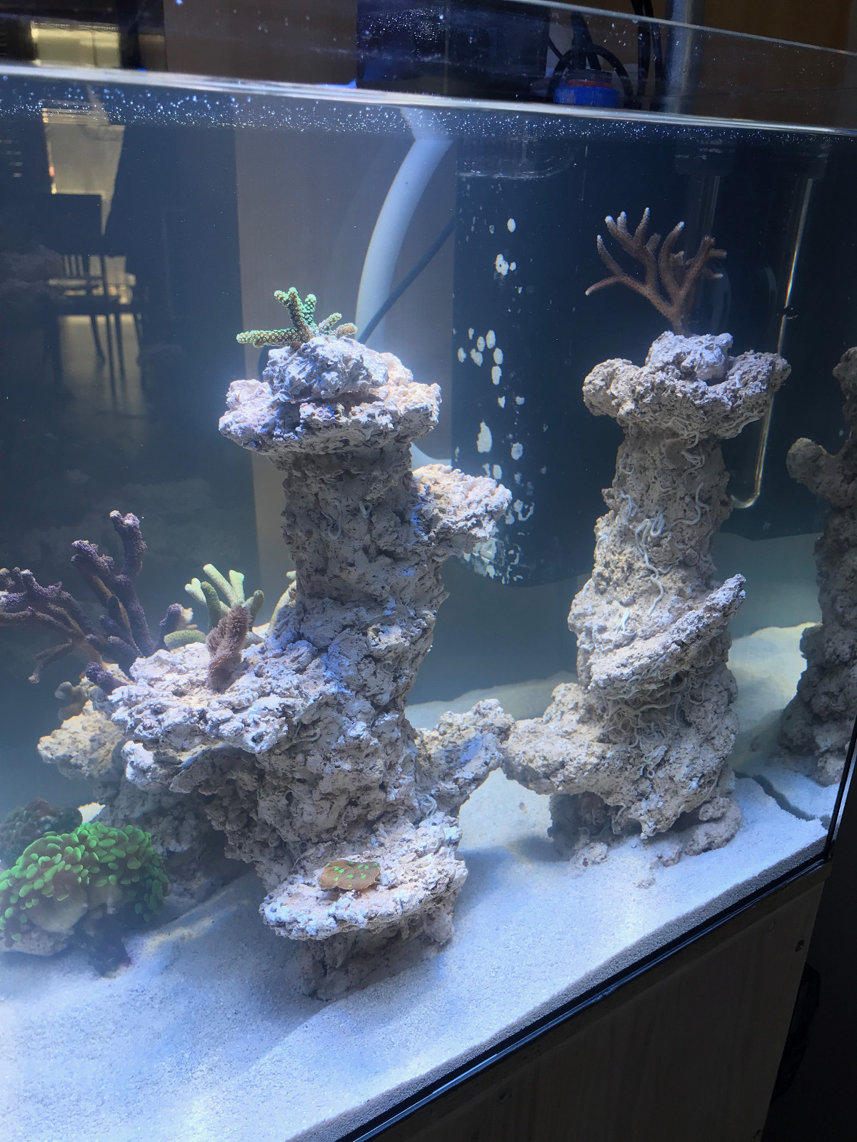 Den Riffaufbau habe ich mit zwei Riffkeramiken von PM Riffkeramik gestaltet. Da ich ich diese noch vom ersten Start im Keller hatte. Vor dem Befüllen wurde die Keramik gründlich gewaschen und gespült. Leider habe ich aber dennoch einen eher hochen PO4 Wert >0.15 mg/l. Absorber hat aber schon einiges geleistet und den Wert von >0.6 mg/l senken können.