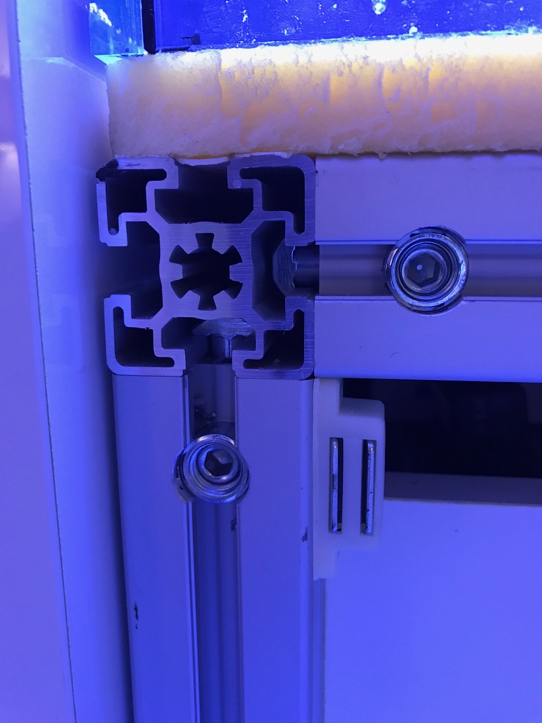 also das Untergestell habe ich über einen Meerwasseraquarien Fachhandel hier in Wien gekauft. Der stellt eig. alle seine Becken so auf und das Gestellt ist echt super. Im Vergleich war mir z.B. Marine Systems immer zu filigran. Such mal nach Bosch Alu Profilen, dann müßtest du etwas im Internet finden. Die Profildicke ist 4,5 cm. Bezüglich der Ecken habe ich ein Foto gemacht: