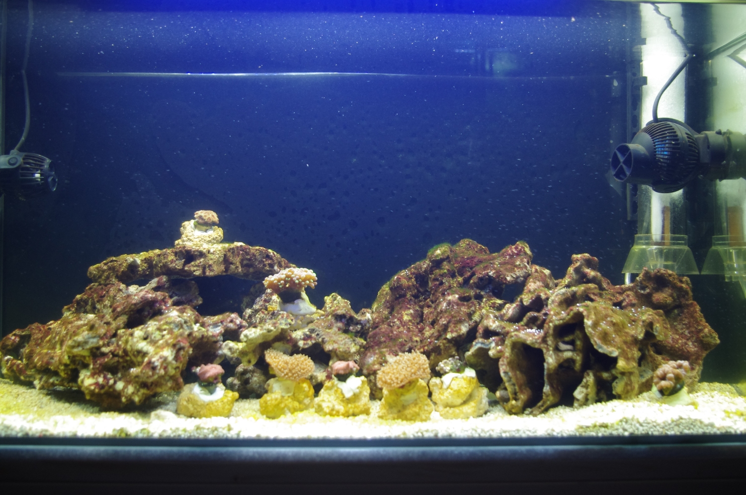 29.09.15 wurden 9 Kg vorgehältertes Lebendgestein eingebracht(Bestellt hatte ich frisches) und mit Sangokai -nano nach Dosierplan begonnen.