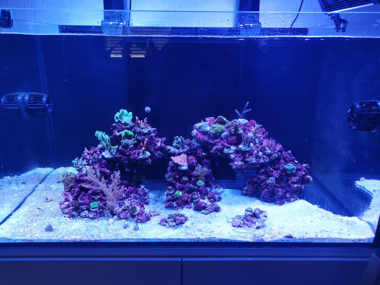 Heute gibt es mal wieder ein Update von mir. Bis jetzt läuft es wirklich gur. Habe eine leichten Kieselalgenbelag, welcher sich aber schon zurück bildet. Der Korallenbesatz ist erstmal fertig. An Fischen sind bis jetzt 3 Pseudochromis fridmani und 1 Ecsenius bicolor drinne. Hatte am Anfang nur 2 von den Pseudochromis fridmani gekauft. Die beiden waren kaum zu sehen. Jetzt wo der dritte im Becken ist, sieht man die Fische auch häufiger im Feiwasser schwimmen. Es gehen alle Fischen ans Frostfutter und fressen auch sehr gut.