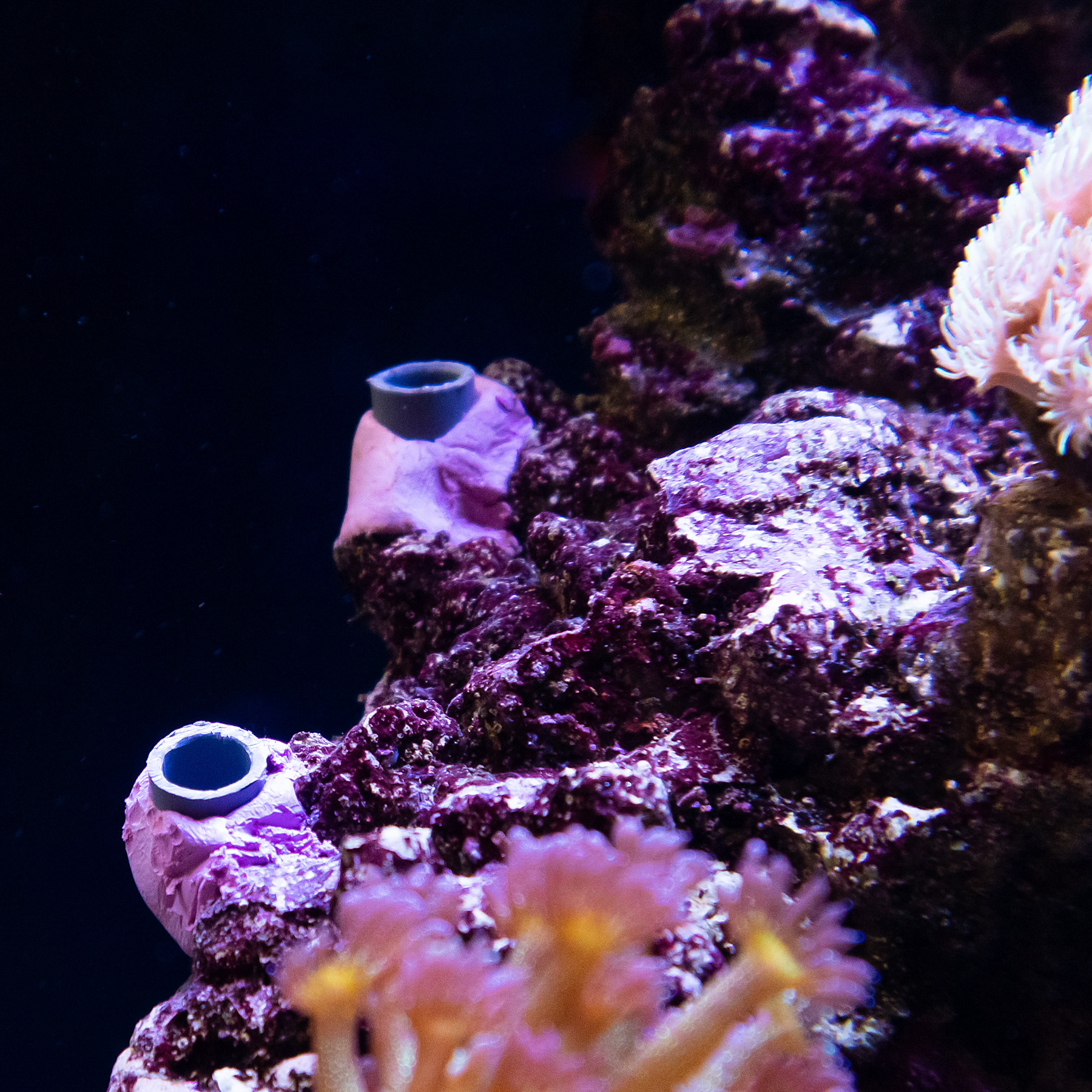 Die SPS Koralle mit derben, dicken Ästen ist (bei mir) farblich eher unscheinbar. Im Tageslicht zeigt sie ein blasses lila - in der Blauphase ein metallisches blau.