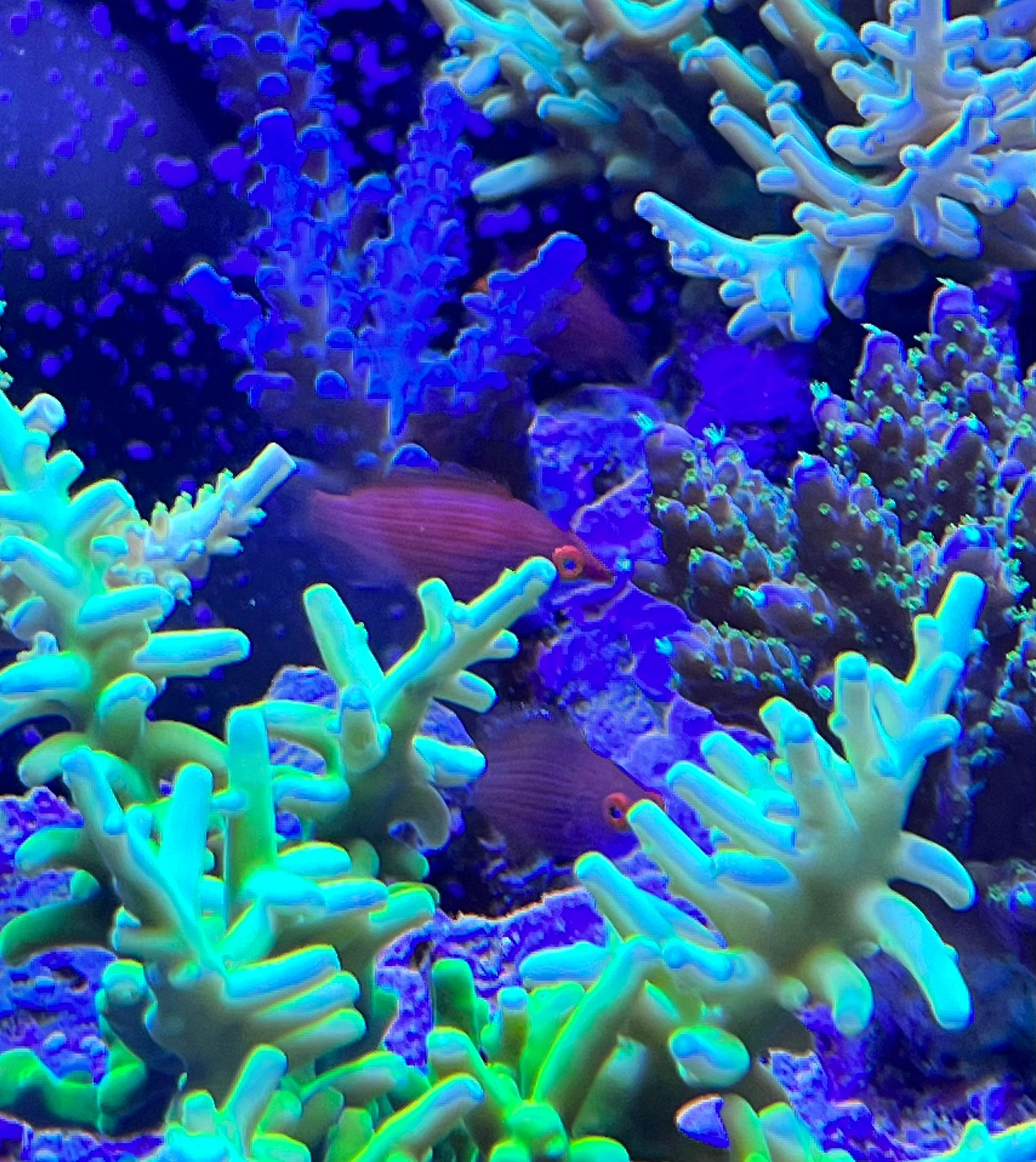 Pseudocheilinops ataenia, ein wunderschöner und nützlicher kleiner Lippfisch. Er lässt sich hervorragend in einer kleinen Gruppe pflegen, bei mir schwimmen 4 Weibchen mit 1 Männchen zusammen. Sie bewegen sich den ganzen Tag zwischen den Acroporen, ständig auf der Suche nach Parasiten. Versorgt wird die Truppe bei mir mit Mysis. Hinzu kommt, das diese Tiere absolut friedlich sind. Eine Bereicherung für jedes (SPS) Becken.