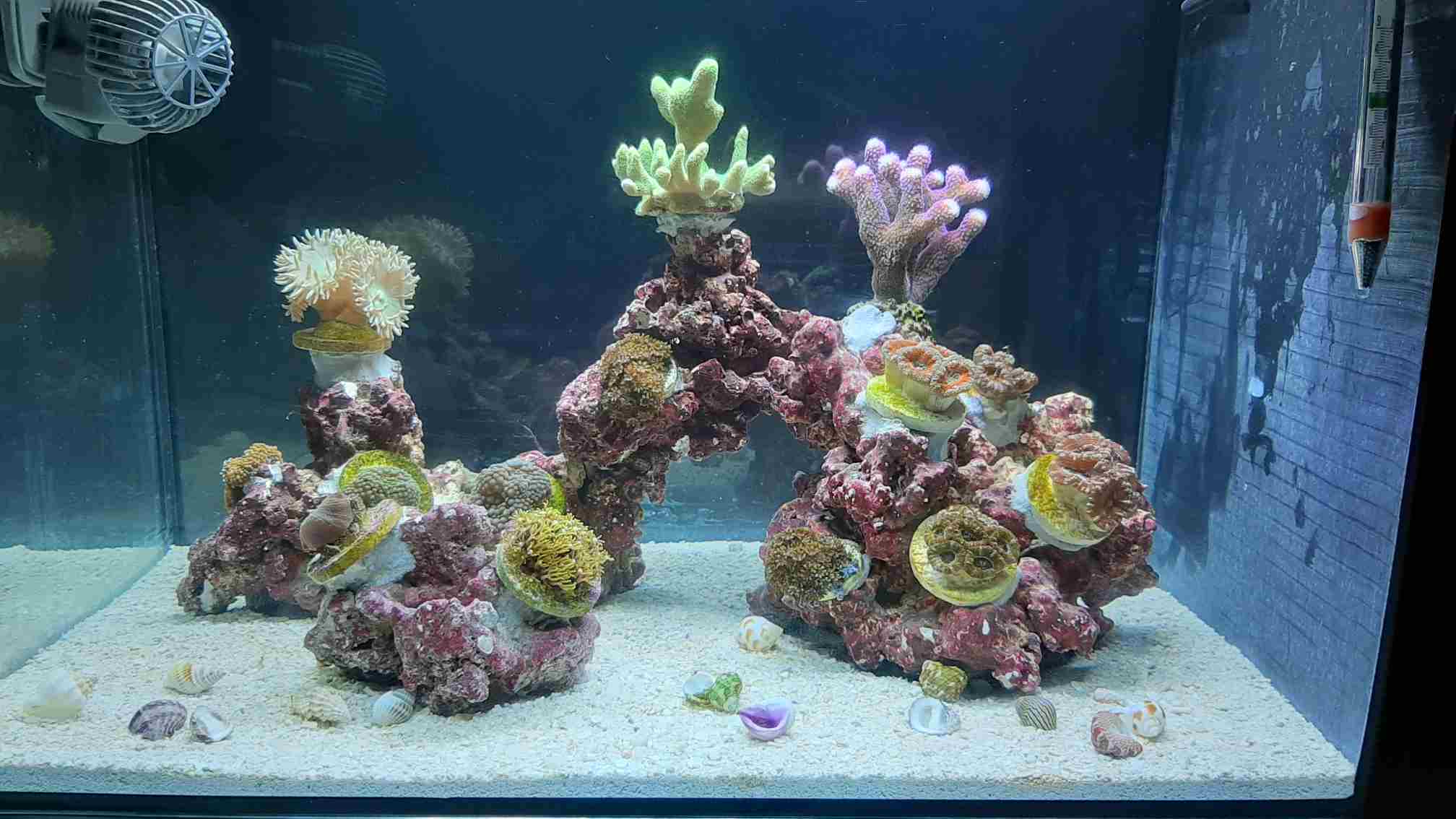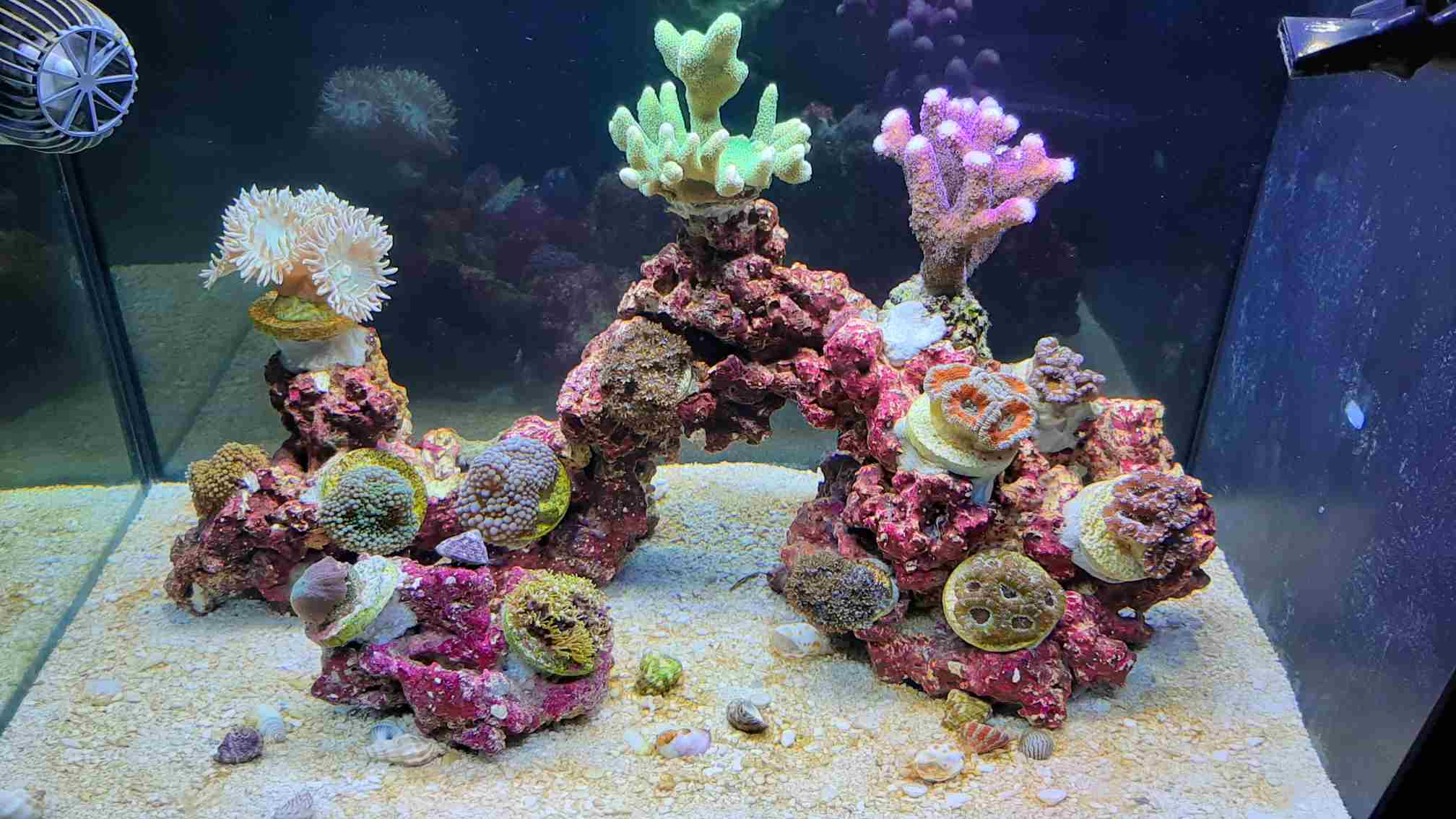 1 Schlangenstern (ca. 2cm, so er denn überlebt hat, denn er befand sich als blinder Passagier an der Unterseite eines Ablegersteins und war beim Auspacken der Koralle dadurch leider kurz der Luft ausgesetzt, weil ich ihn zu spät gesehen habe - ich habe ihn am Vormittag mit ins Becken, am Abend hat er sich noch bewegt, ich hoffe also, dass er den kritischen Zeitraum bereits überstanden hat)