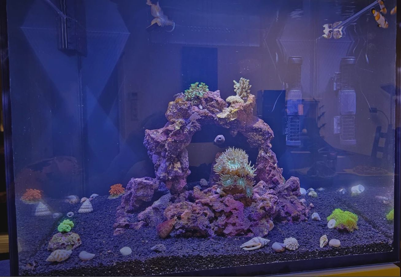 Eingezogen sind jetzt ein paar Falsche Clownfische (Amphiprion ocellaris) und dazu eine Kupferanemone (Entacmaea quadricolor).