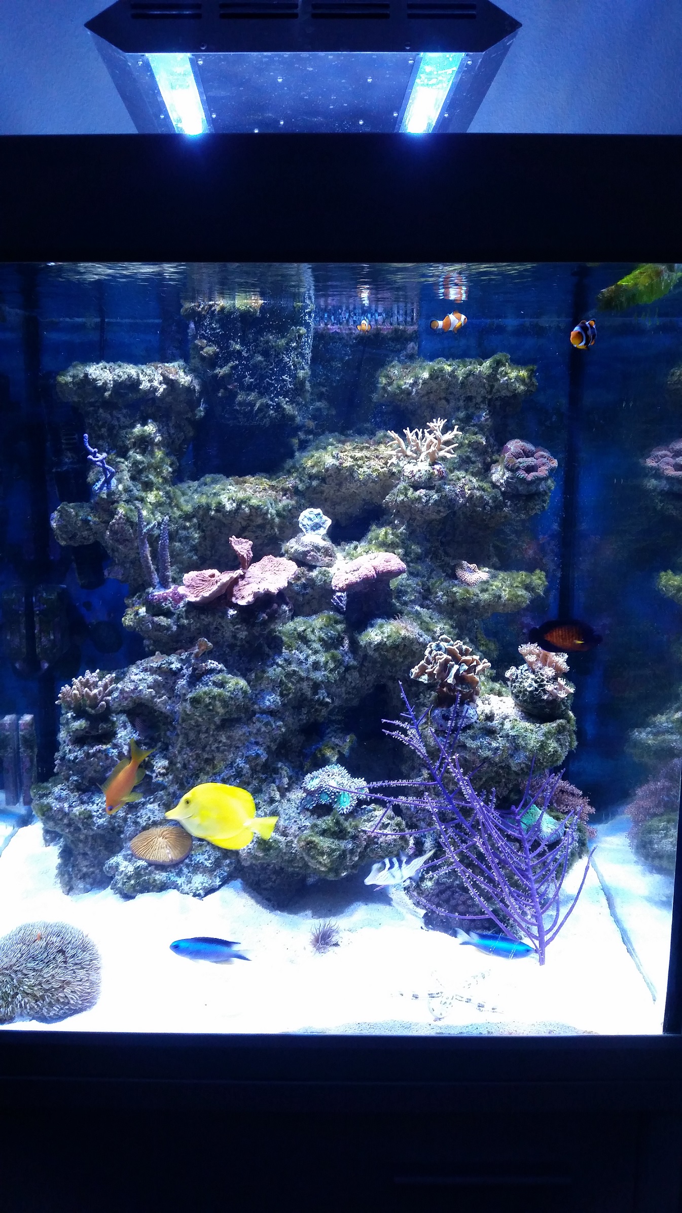 Dan hätte ich noch ein Zitronen Doc, 2 zwerg Kaiserfische, 1 Grundel und 3 Anemonenfische im Becken. Der relativ grosse Fischbesatz ist einer meiner Anfängerfehler.
