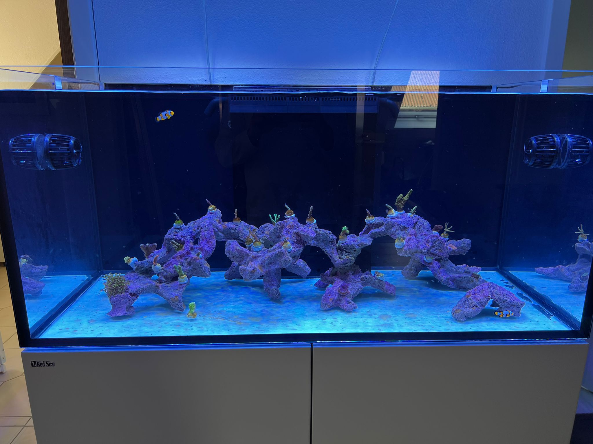 ich dosiere bis es ankommt einfach bei Bedarf die Start Produkte. Ansonsten ist alles gut. Gestern abend ein paar Fridmanis eingesetzt. Paar Micromussa und Goniopora sind dazu gekommen. Stratons laufen 10.5 std auf tagesmax von 30%. Wenn ich 3 Tage Basis dosiert habe geh ich auf 11 hoch.