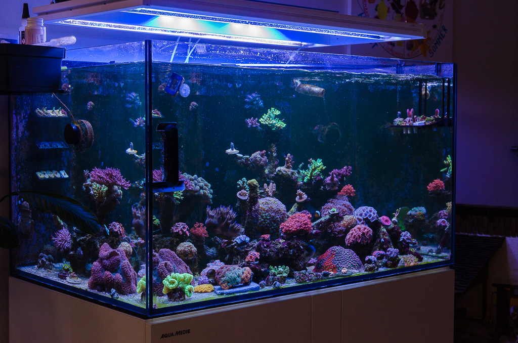 Auch die anfängliche Nährstofflimitierung hat sich erledigt. PO4 liegt mittlerweile stabil bei ca. 0.03 - 0.05 und NO3 bei 5-10. Ich habe in den letzten Wochen auch angefangen den Sand langsam abzusaugen, da er doch ziemlich verdreckt ist und beim Anstochern immer eine kleine Wolke durchs Becken ging. Evtl. ist daher mein PO4 Wert auch mal eben leicht auf 0.075 angestiegen. Mal schauen, ich denke ich werde das Becken erst mal ohne Sand weiter betreiben und am Boden versuchen noch ein paar mehr Korallen zu platzieren.