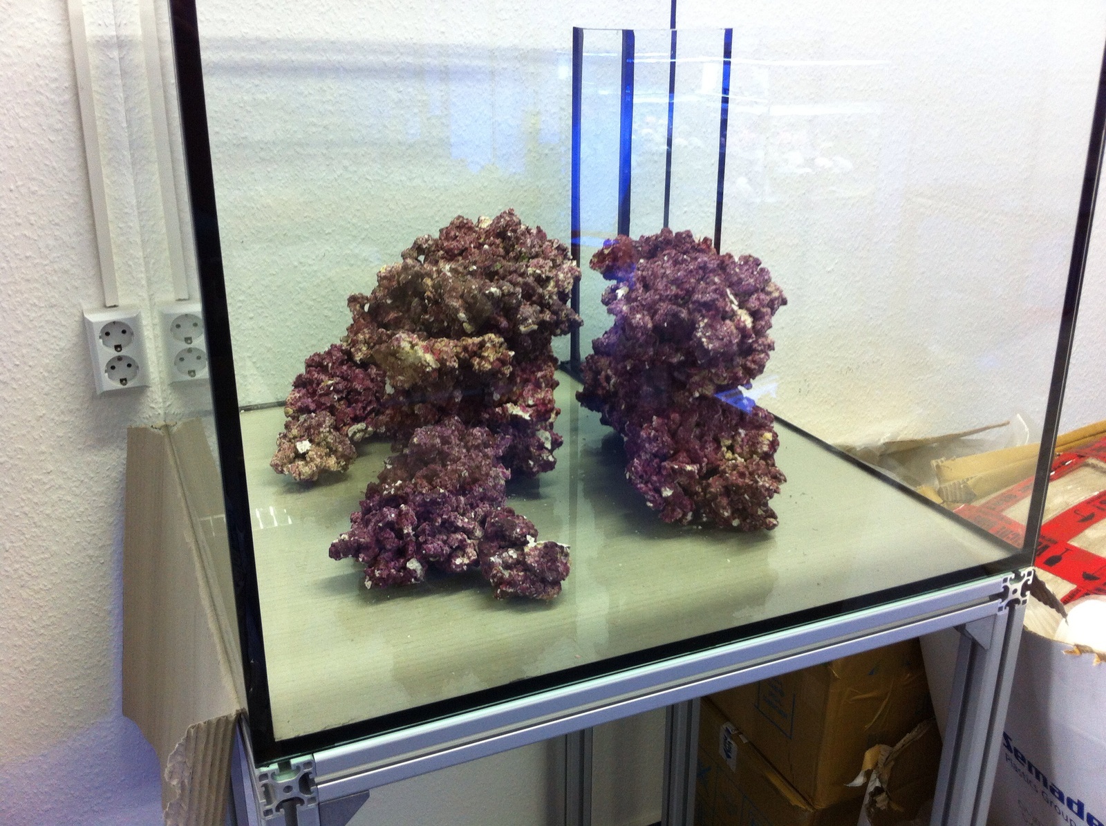 Ich habe mich für Real Reef Rocks entschieden und mir eine Box von den normalen reef rocks in den Größen S und M bestellt. Das waren etwas mehr als 20 kg. Das Gestaltungsthema ist eine "Mikro-Schlucht" zwischen zwei Plateaus, eines davon etwas ausladender, das andere eher kompakt. Die Ausrichtung erfolgt über die Diagonale durch das Becken, so, dass man den Schacht beim Durchblick durch die Schlucht nicht sieht und das rechte Plateau ebenfalls den Schacht verdeckt. Im rechten Plateau sind die Steine so strukturiert und positioniert, dass ein Loch in die Schlucht hinein als Durchgang besteht. Nach links hin ist die Schlucht ziemlich dicht, wobei kleine Fische wie Zweigbarsche überall durchkommen. So ergeben sich insgesamt drei Beckenpartien: die Frontansicht zeigt die Schlucht und die Plateaus in der Vorderansicht. Die linke Ansicht zeigt das Plateau mit einem Ausläufer in den Sand, blickdicht zur Schlucht (hier kommen ggf. einige kleine Dendrophyllia oder Tubastrea micrantha hin (letztere habe ich aus einer Import-Acropora vom Substrat getrennt und auf einem Ablegersteinchen positioniert und angefüttert). Die rechte Ansicht zeigt das Plateau mit dem Durchgang in die Schlucht.