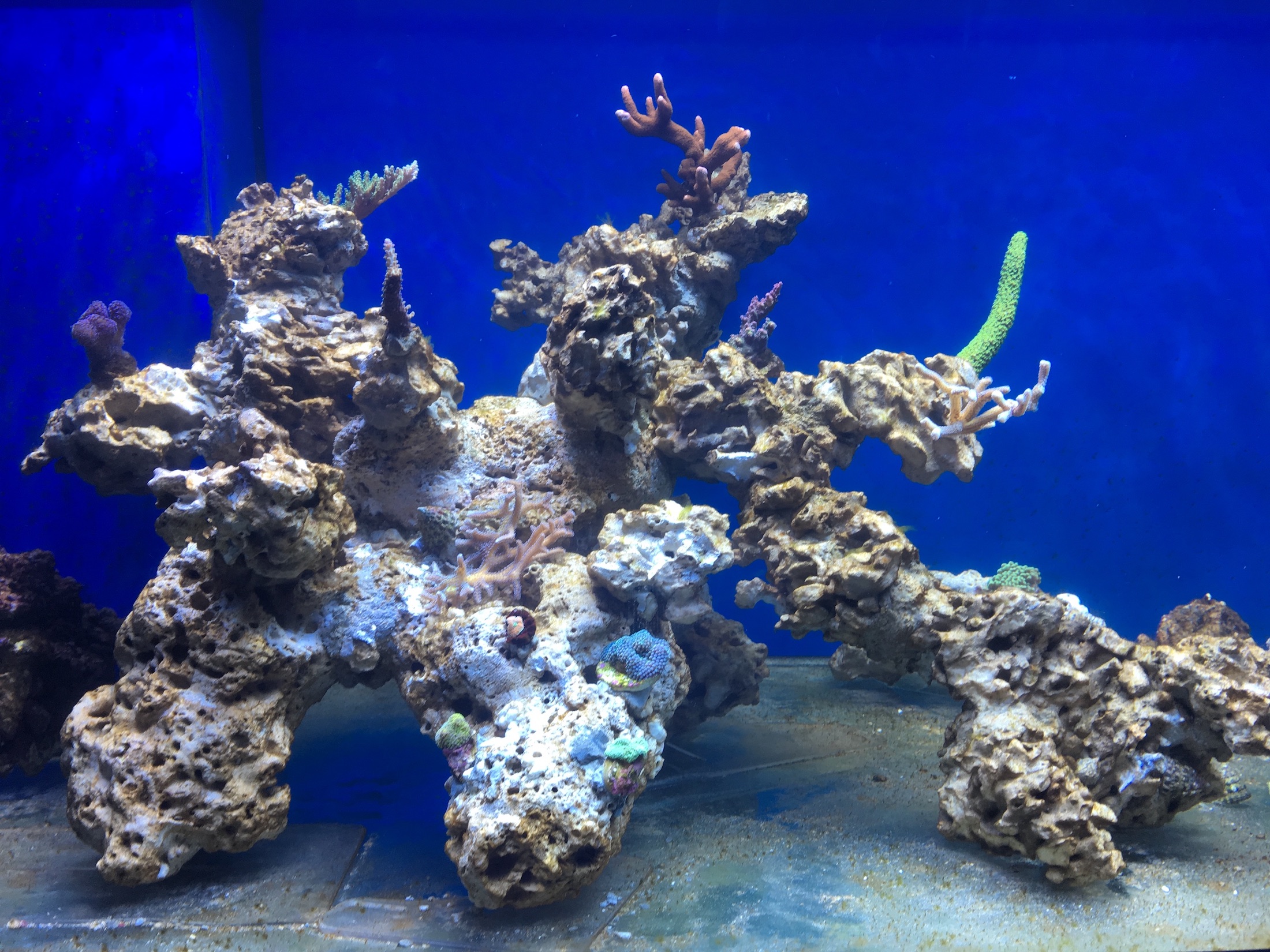 Zum Aufbau aus totem Riffgestein: tatsächlich habe ich ziemlich mit Phosphat gekämpft - ewiges Spülen mit Osmosewasser und Adsorber. Nachdem das ok war, selbes Spiel mit Salzwasser - inzwischen ist mir das Phosphat nach unten durch gerauscht und kaum noch nachweisbar