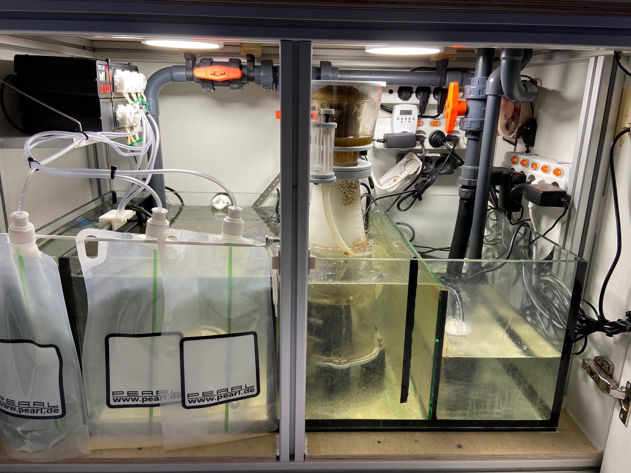 Wasserwerte habe ich immer brav gemessen, bis ich Anfang April dann bei PO4 n.n. hatte und anfing ATI Nutritions P zu dosieren. Relativ unregelmäßig, da meine Erfahrungen mit der Zugabe von Elementen quasi nicht vorhanden ist und ich Angst hatte, plötzlich zuviel Phosphat im Wasser zu haben. In den letzten 3 Wochen lief ich 3x in ein PO4 Wert von 0 und angehoben wurde es zwischenzeitlich bis maximal 0,04 (bei weniger als 4ml am Tag passierte gar nix). Die Korallen stehen zunehmend schlechter da, ich habe eine Montipora, 2 grüne SPS und die Hälfte einer 10 köpfigen Euphyllia verloren. Selbst die Milka, welche als sehr robust gilt, löst sich immer mehr auf. Weichkorallen stehen grundsätzlich gut da, aber selbst die machen die letzten beiden Tagen nicht mehr auf. Ebenso sind ungefähr seit Beginn der Dosierung Cyano Bakterien aufgetreten. Ich bin davon ausgegangen, dass das Auf und Ab von PO4, sowie die mehrmaligen Nährstofflimitierungen für das schlechte Korallenbild verantwortlich sind, sodass ich vor wenigen Tagen per Dosierpumpe dosiert habe. Nun habe ich das aktuellste Video von Jörg Kokott auf youtube gesehen und bin nach diesem der Meinung, dass bei mir etwas anderes die Ursache für die Probleme ist.