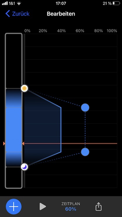 Insgesamt würde ich erstmal 11 Stunden beleuchten. 3 Stunden hoch auf 60 %, 5 Stunden halten, 3 Stunden runter auf 0. Fertig. Keine Blaulicht oder Mondphasen. Man kann natürlich auch eine schöne Kurve draus machen.
