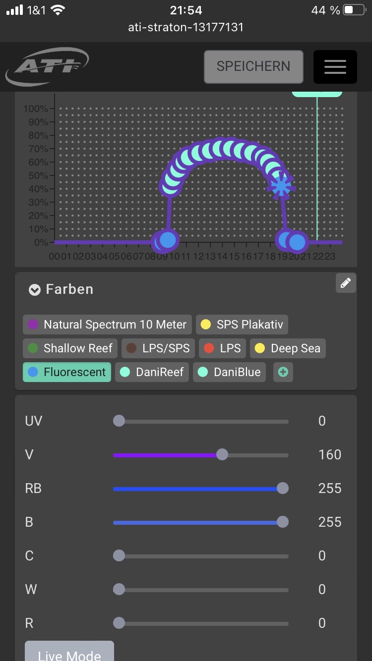 Beleuchtung ATI Straton pro 102. Die ATI läuft bei 70% (etwa 86 Watt, 480 PAR an der Oberfläche). Von der Einstellung sende ich ein Bild.
