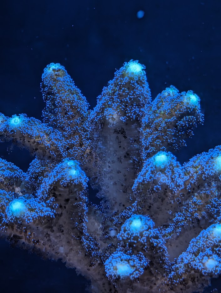Über dem Becken habe ich 2x AI Hydra 32. Die Lichteinstellungen habe ich zunächst aus der App probiert, dann aus dem Netz was gezogen, bis wirdie Einstellungen von Jörg entdeckt haben https://www.sangokai.org/forum/viewtopi ... =53&t=3245. Diese laufen aktuell gedrosselt und wegen Cyanobakterien ohne rot/grün Anteil und reduziertem Weißlichtanteil. Wir sind uns wegen der Intensität unsicher, ob es nicht zu wenig Licht ist. Die Beleuchtungsdauer ist aktuell von 11:20 bis 20:20, wobei die «volle» Intensität zwischen 11:50 und 19:50 liegt (8 Stunden).