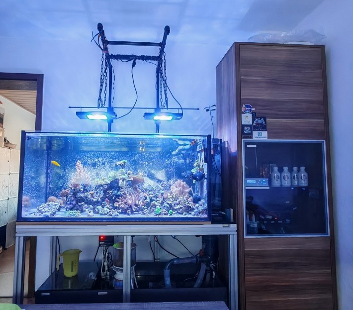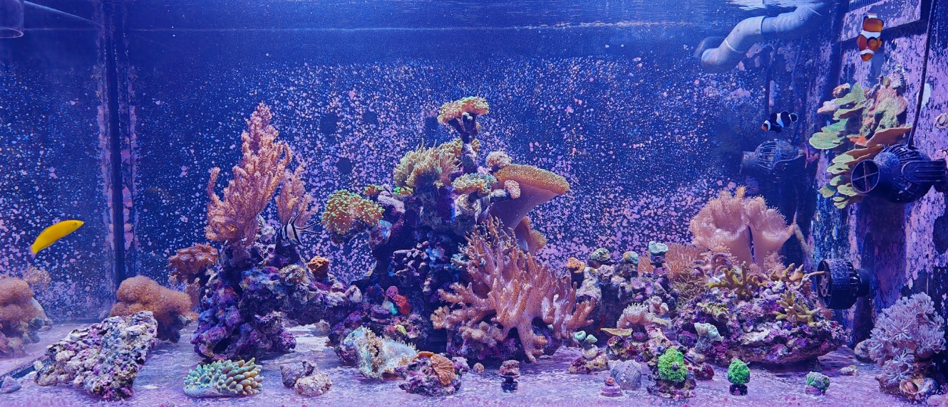 Es handelt sich hier um mein erstes Meerwasserbecken. Dieses läuft jetzt seit September 2024, es hat insgesamt 500l Systemvolumen. Das Hauptbecken hat die Nettomaße 117,5 x 62,7 x 49,5.