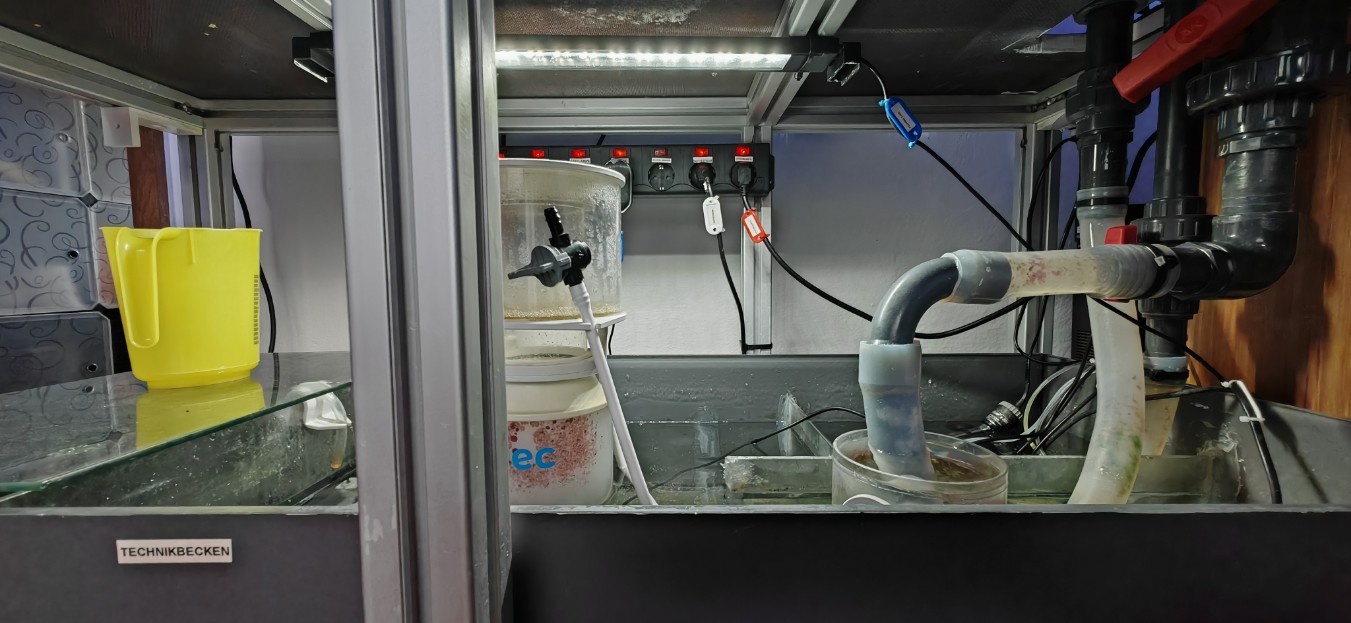 Beleuchtet wird das Hauptbecken mit zwei AI Hydra Edge 44HD überm Technikbecken hab ich eine Fluval 2.0 drüber, diese ist aber nur zum arbeiten am TB angebracht.
