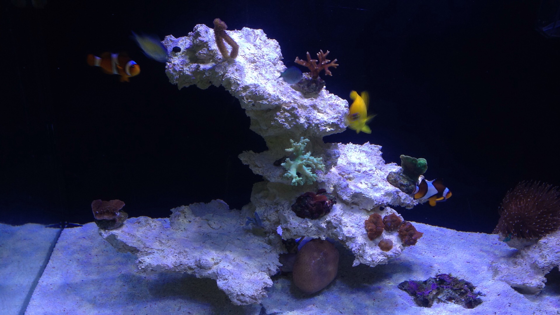 Darin Befindet sich eine Riffsäule und eine Höhle von Riffkeramik.de sowie 10 Kg Sand von Aqua Medic in der Körnung 0-1mm. Als Salz wird das Tropic Marin Pro Reef verwendet.
