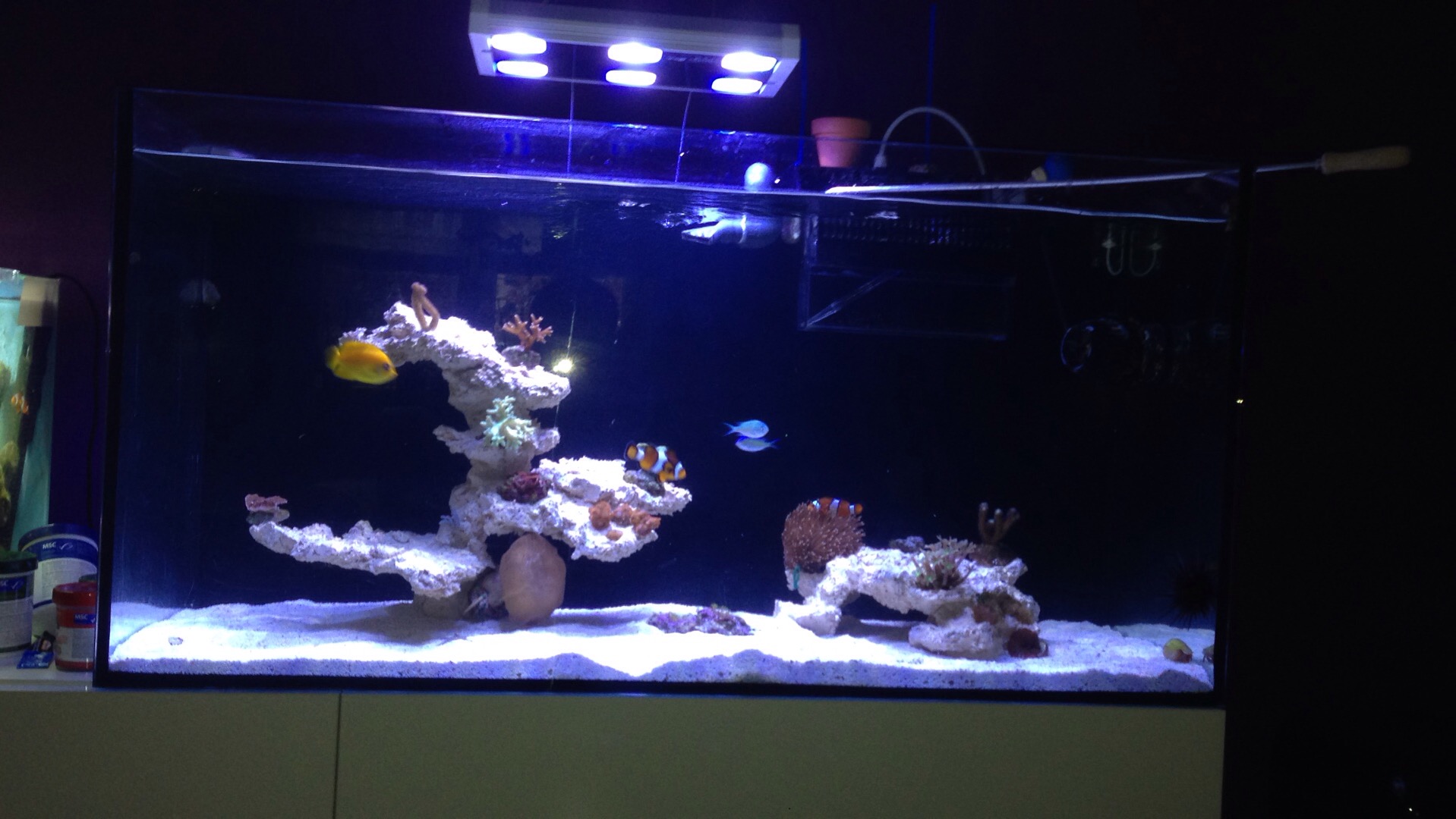 Darin Befindet sich eine Riffsäule und eine Höhle von Riffkeramik.de sowie 10 Kg Sand von Aqua Medic in der Körnung 0-1mm. Als Salz wird das Tropic Marin Pro Reef verwendet.