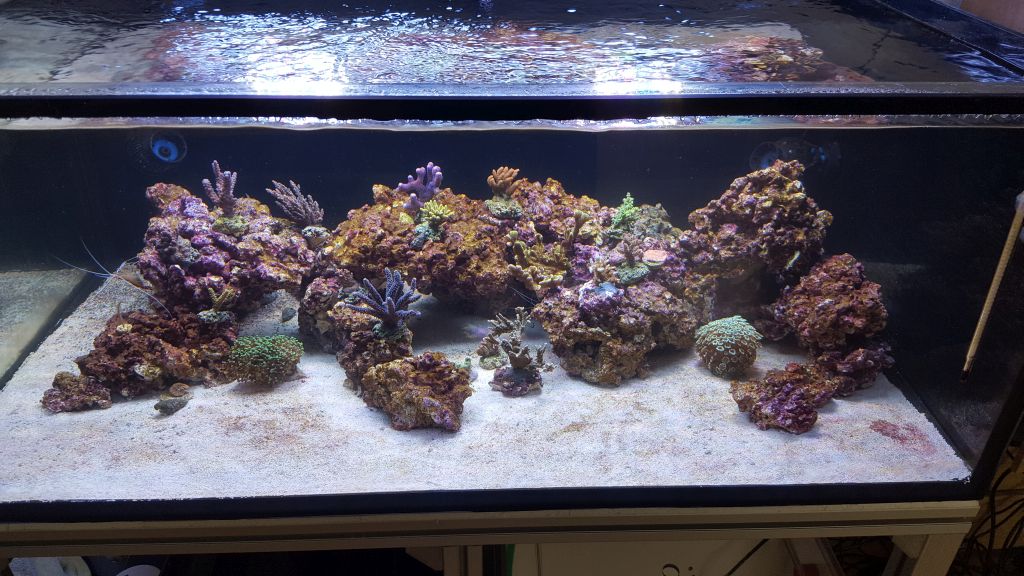Den Pott habe ich Ostern 2016 gestartet, Algen etc kamen mal überhaupt nicht. Von anfang hatte ich leider das Problem PO4 nn und NO3 nn. Seit ein paar Tagen dosiere ich Complete und Complex. No3 liegt jetzt bei 1-2mg, PO4 leider immer noch bei nn obwohl ich 8ml auf 430L netto dosiere und das jeden Tag. Unglaublicher weise machen sich seit zwei Tagen ca Goldalgen breit, die meine ich aber seltsamer weise schon wieder auf dem Rückmarsch sind. In kürze werde ich mit dem Basis-System 3+2 und Jod starten. Jetzt lasse ich mal Bilder sprechen, bei Fragen oder Anregungen immer her damit.