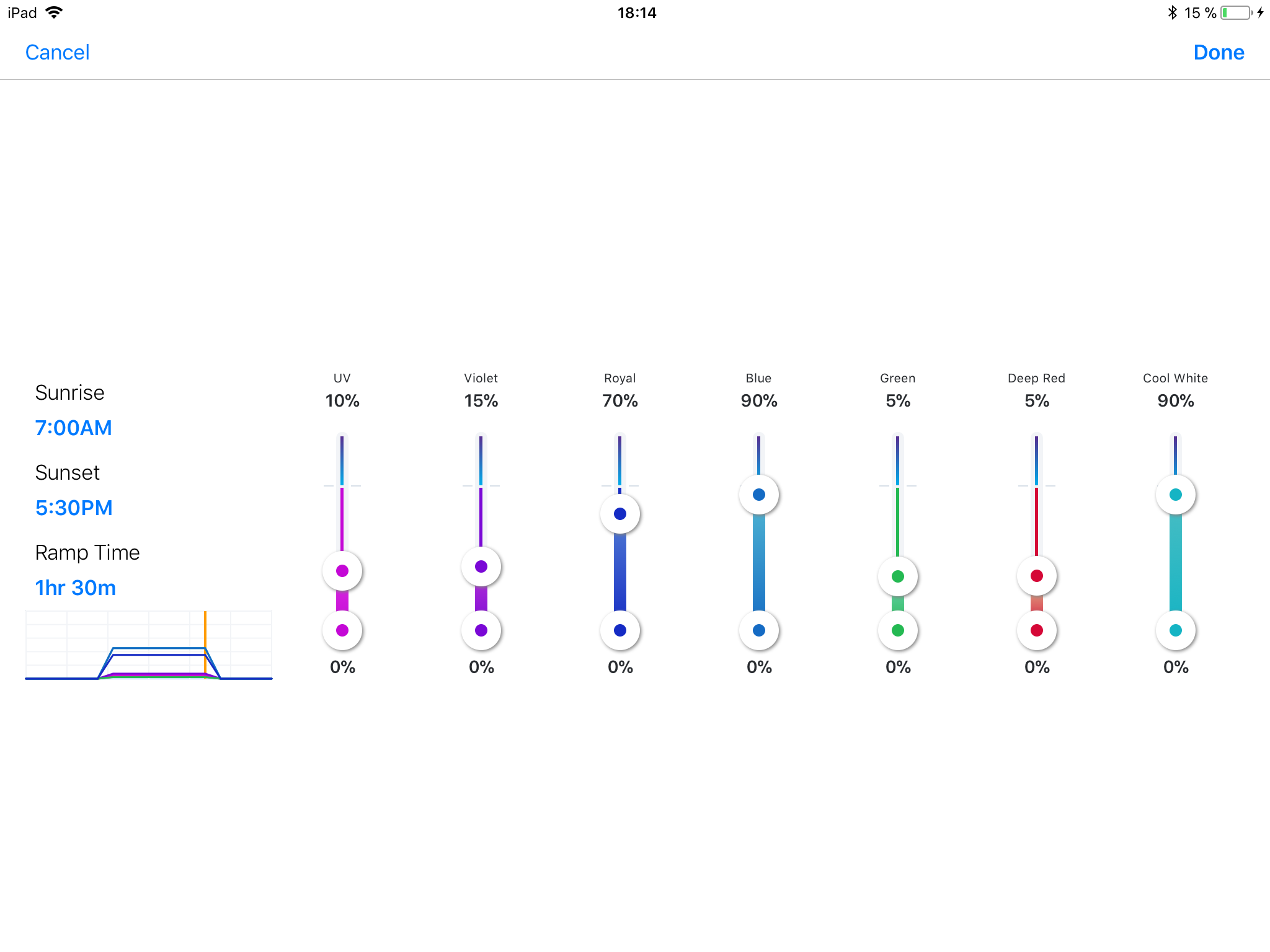 Meine Lampen fahren nach einschalten 1.5h hoch bis zur eingestellten Maximalleistung und fahren Abends genau so wieder runter. Insgesamt sind es 12h Beleuchtungsdauer.