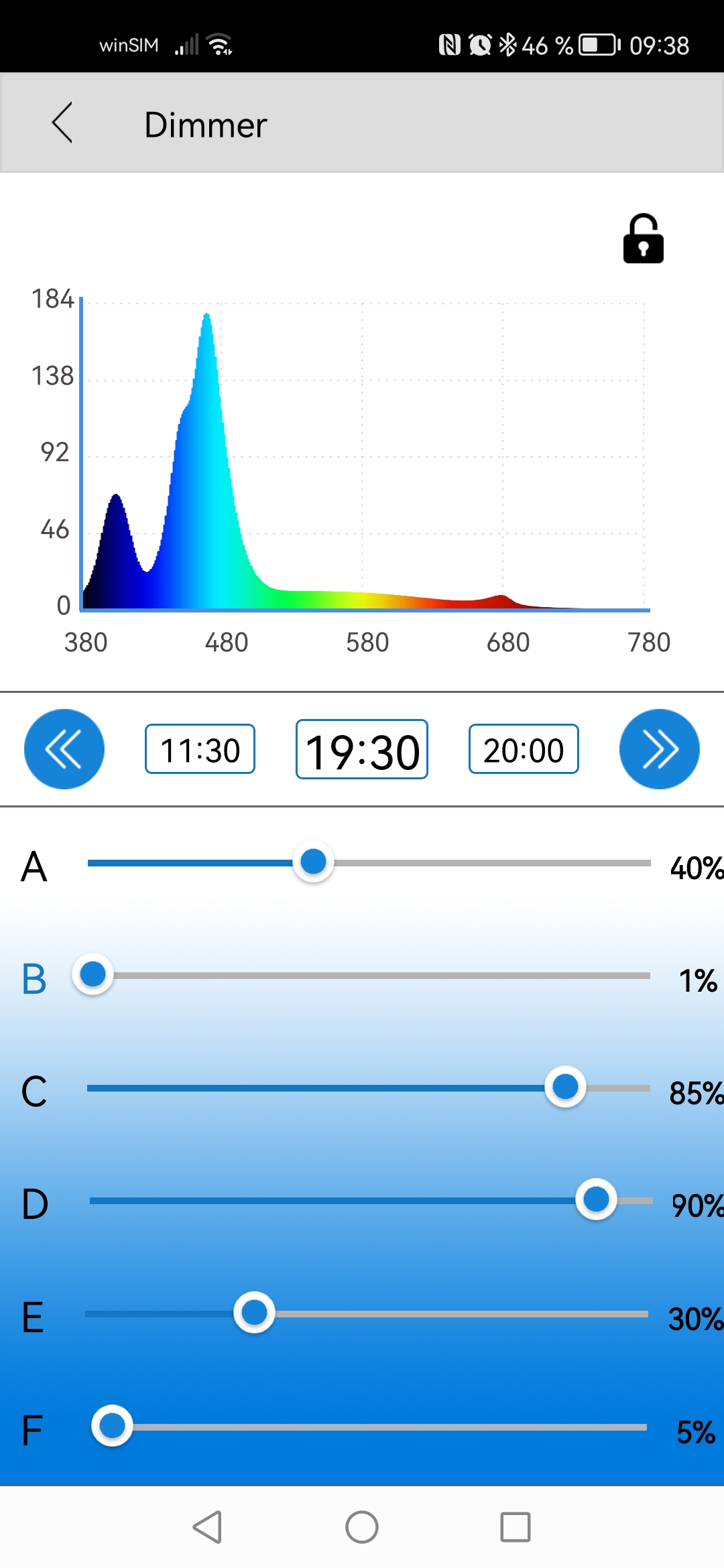 Ist auf jeden Fall so wie es ausschaut ein sehr blaulastiges Spektrum, schwer einzustellen mit einer App die gar nicht für die Lampe entwickelt ist, aber trotzdem verkauft wird... Wenn Dir das Licht so gefällt ist das sicher okay, hat aber im Blau v.a. im Royalblau bei 450 nm schon ordentlich Intensität. Musst Du schauen, wie das Becken damit zurecht kommt oder ob Du da auch nochmal etwas runter regelst.