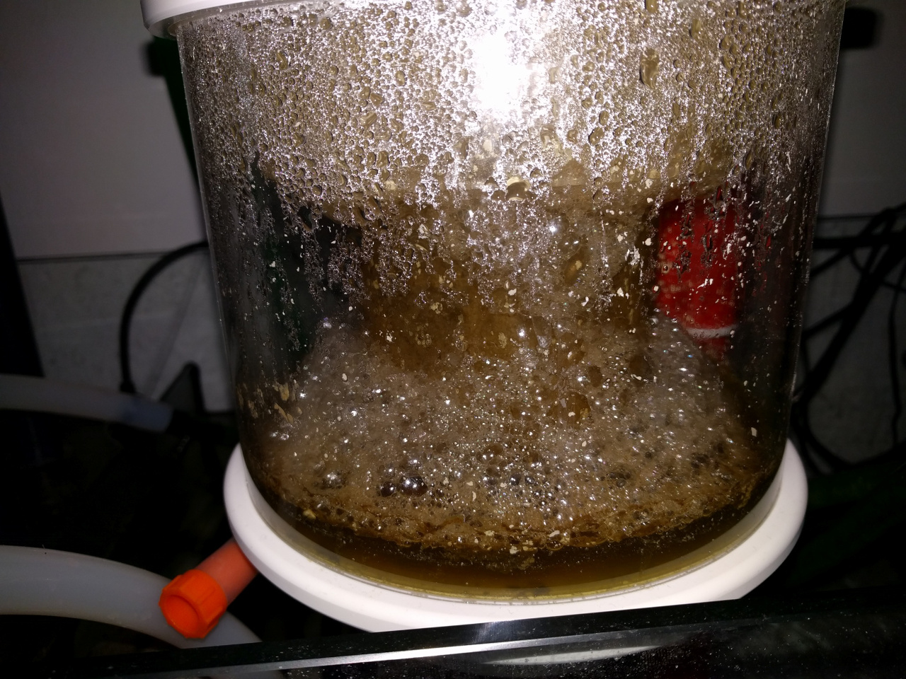 Allerdings werde ich da nicht ganz schlau draus.Sollte der Abschäumer ausreichend trockenen Schaum produzieren, ist es empfehlenswert, am äußerem Ende des Steigrohrs, dieses einzufetten, ebenfalls den inneren Schaumring. Dadurch wird ein Auffüllen des Schaumbechers, mit festem, trockenem Schaum, verhindert, da die Blasen bei Berührung mit Fetten, sofort platzen. So sammelt sich im Absorbattopf nur abgeschäumtes Absorbat und kein fester Schaum der u.U. aus den Topf Entgasungslöchern treten könnte.