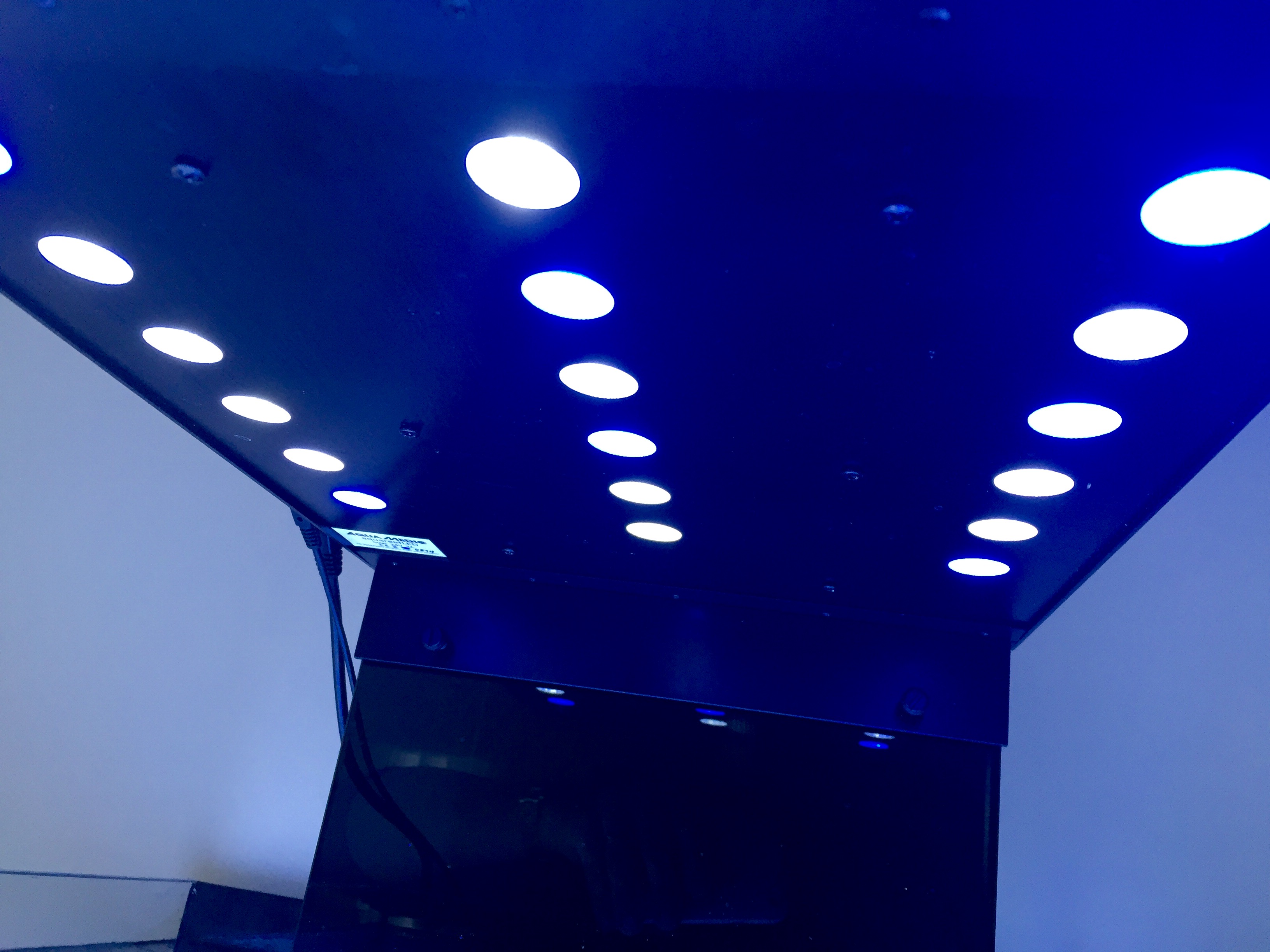 aquareefLED mit 18 Hochleistungs-Cree LEDs à 3 Watt (7 x 3 Watt blau und 11 x 3 Watt 12.000 K) mit einer Gesamtleistung von ca. 50 Watt.