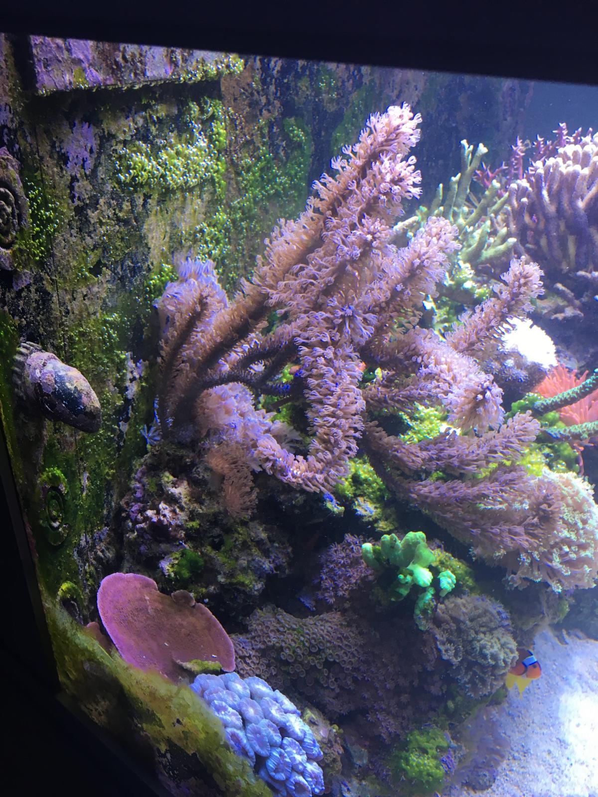 Deine Korallen geht es ja ganz gut, das ist die Hauptsache. Rechts die braune hystrix sieht nicht so dolle aus auf dem Foto, vielleicht täuscht das auch, aber das sitzen auch Cyanos zwischen und die wachsen normalerweise nur auf toten stellen. Eine gesunde Koralle wird von Cyanos meist nicht bedrängt.