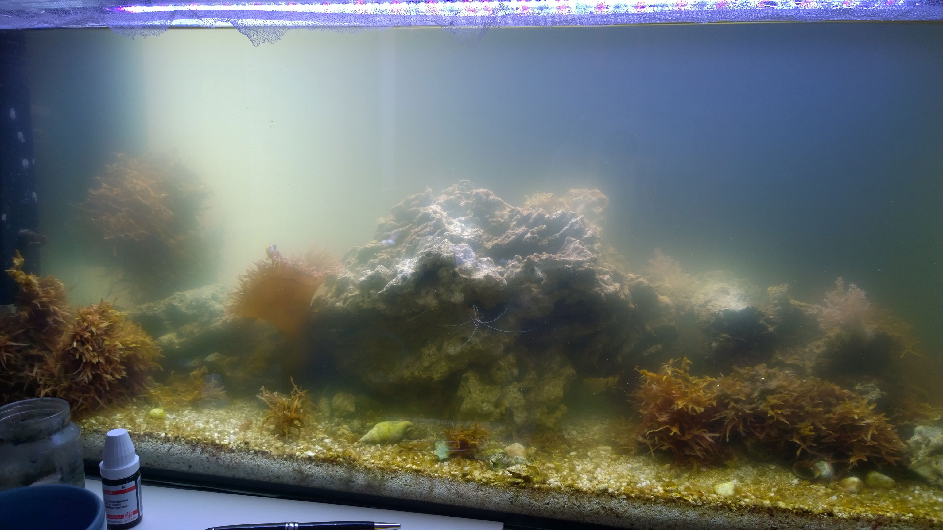 So, als kurzfristige Maßnahme haben wir gestern einen 50% Wasserwechsel durchgeführt, so kommt wenigstens noch mal Licht unten an und die Fische sehen auch wo sie hinschwimmen.