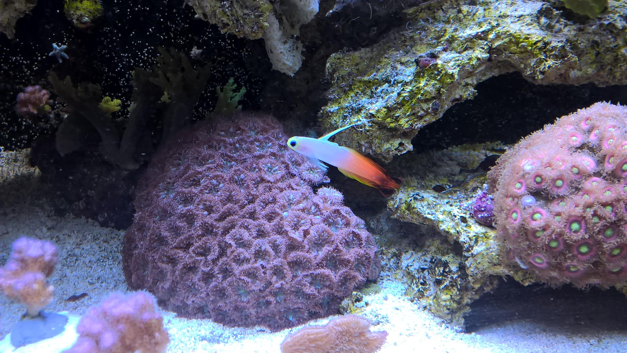 Letzte Woche hab ich dann noch zwei Mithrax- Krabben und 2 Gramma Loreto eingesetzt. Die Gramma haben sich die ersten Tage etwas mit dem Schleimfisch gezankt, jetzt kommt es aber höchstens noch zu Drohgebärden.