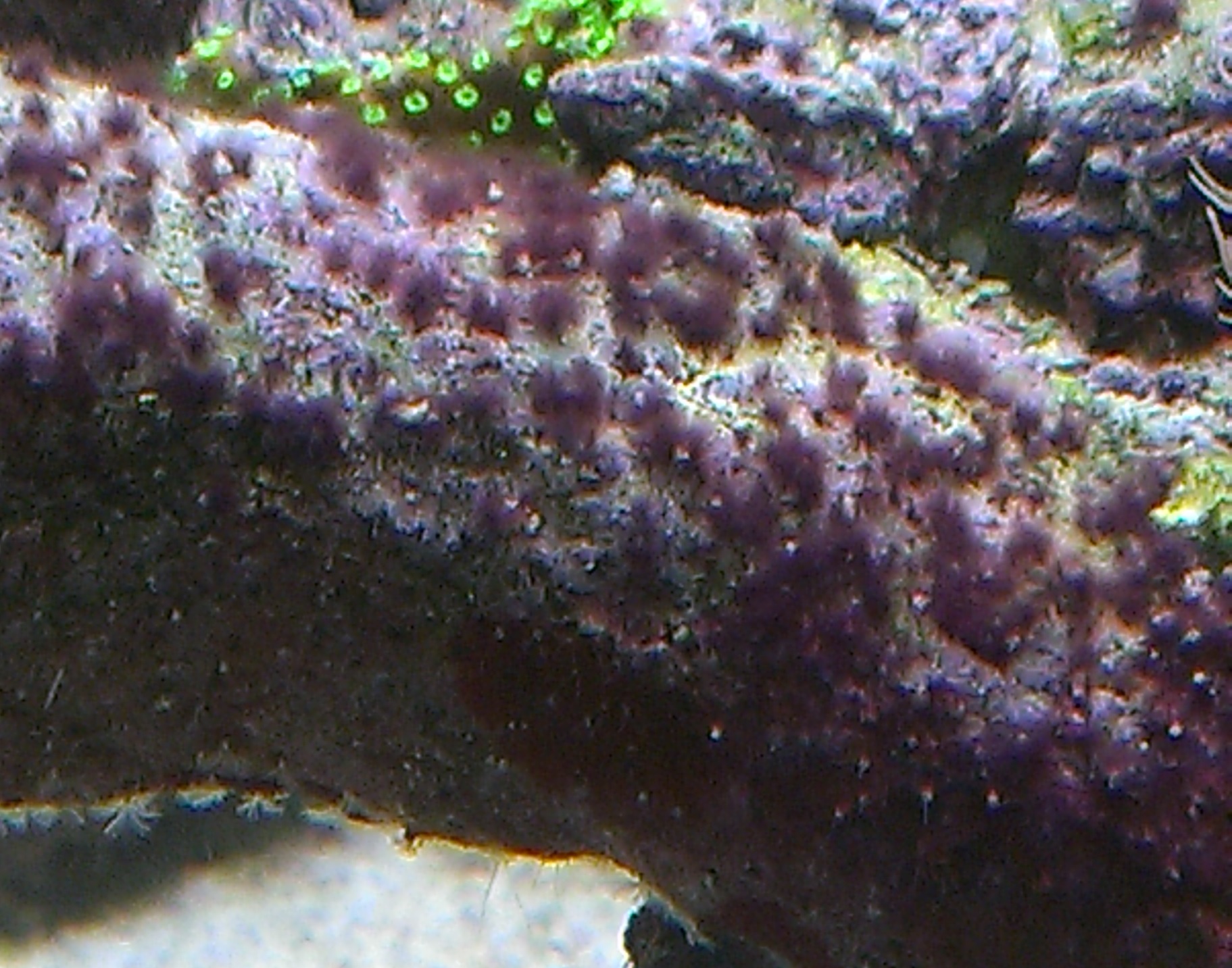 Außerdem sind alle Riffäste (Fette Montiporaäste) nahtlos mit durchsichtigen kurzen Härchen überzogen. Aus jedem alten Polypenloch ragt ein 1 -2 mm dünnes langes durchsichtiges Haar herraus. Man sieht sie eigentlich nur wenn manim richtigen Winkel und Lichtschein drauf schaut (Taschenlampe). Sie sehen aus wie die kleinen Filtrieren die öfter in Korallen und Steinen sitzen und aktiv diese aus und einfahren aber meine sind absolut unbewegt.