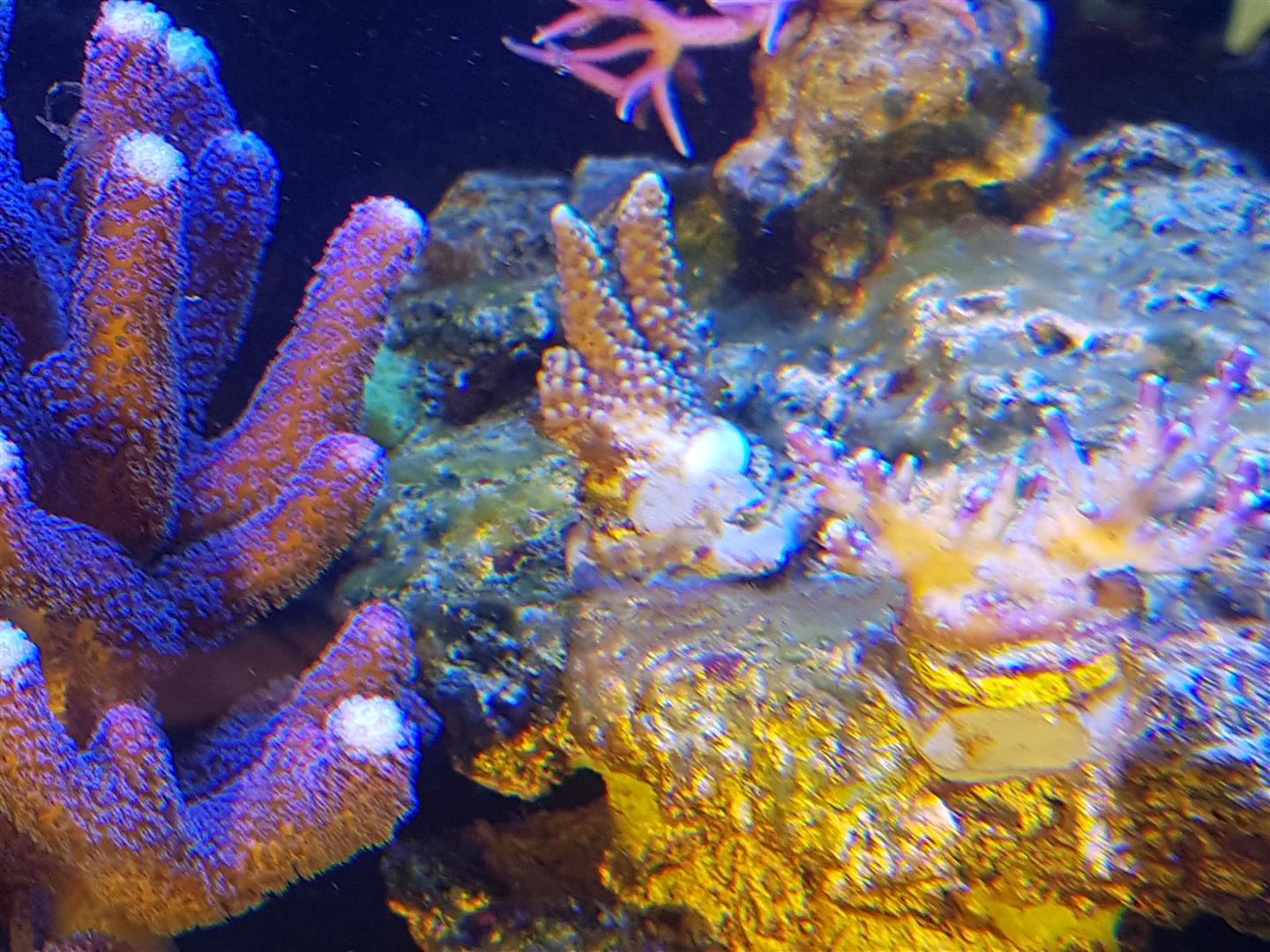 Ich bin mit der allgemeinen Entwicklung sehr zufrieden. Die Korallen zeigen gutes Wachstum und stehen gut. Allerdings mit einer Ausnahme, eine Koralle zeigt Gewebeverlust vom Fuß her. Ich habe versucht, es zu fotografieren, allerdings bekomme ich mit dem Handy keine scharfe Aufnahme zustanden. :-(