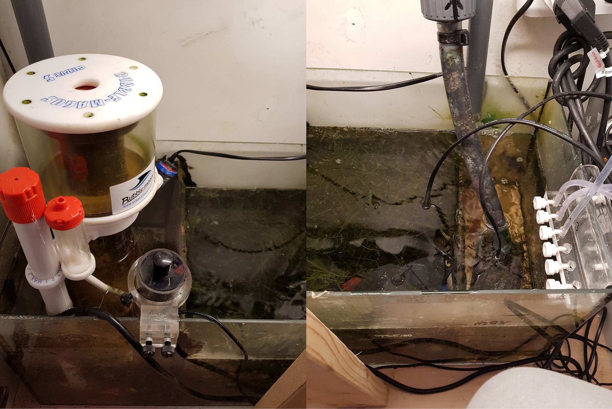 Das Technikbecken glänzt wieder, wurde alles ausgebaut gründlich gespült und direkt das alte Wasser durch frisches ersetzt in Salinität ausgeglichen. Die Algen sind ausgezogen, bin mal gespannt wie sich die Nährstoffe verhalten.