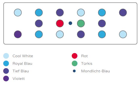 Hallo Thomas, laut Hersteller sind in der aquaBAR pro Modul 17 LEDs verbaut. Untenstehende Grafik zeigt die unterschiedlichen LED-Farben und deren Anordnung bei der aquaBAR Reef Blue für Meerwasseraquarien. Ebenso das Spektrum. Wie hast Du das Modul aktuell eingestellt?