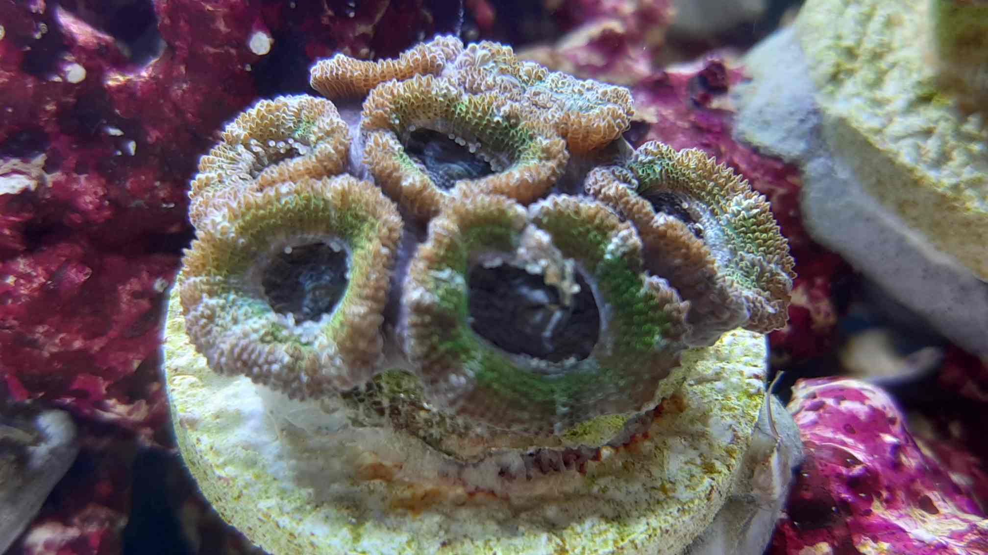 Ich habe eine grün-lila Acanthastrea im Becken, die sich in den letzten Tagen nicht gerade zum Positiven entwickelt. Die Köpfe liegen nicht mehr aneinander, das Skelett sieht aus, als wenn es von innen grün veralgen würde, am linken Rand kommt etwas raus, das von der Form her aussieht wie eine Seepocke und darunter wächst etwas weiches, milchig-kugeliges, das von den Turboschnecken gefressen wird, aber nach einer gewissen Zeit wieder "nachwächst"...