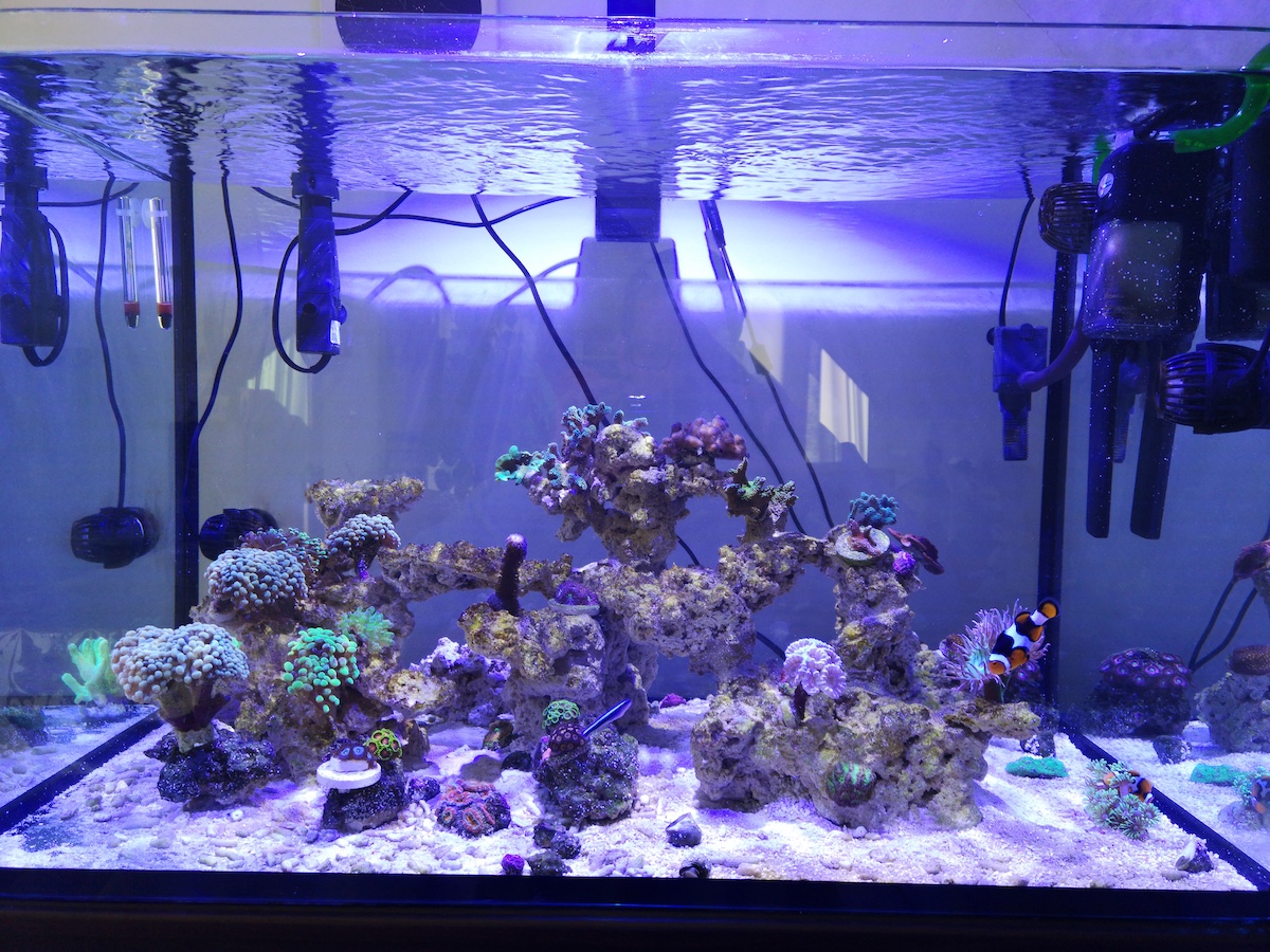 Seit Freitag stehen hier nun also 200L (175L Netto) im Wohnzimmer. Umgezogen habe ich das ganze Becken an einem Tag innerhalb von knapp 10 Stunden. Es kam zu keinen großen Zwischenfällen, außer dass mir 2 Stück von der großen Seriatopora abgebrochen sind. Die sah vorher aber schon nicht mehr gut aus, von daher halb so wild. Sie ist zum Glück recht groß und ich hoffe, dass aus ihr noch ein schöner großer Stock wird im neuen Becken.