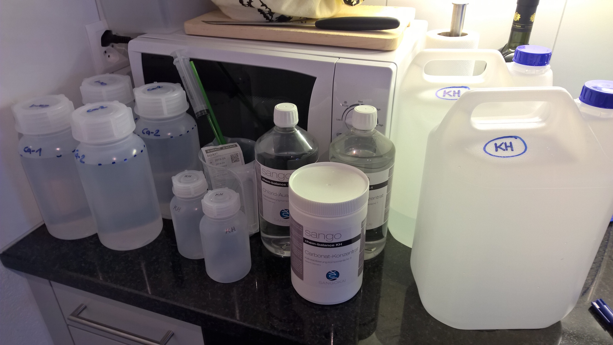 So bin an den Vorbereitungen auf die "Balance" Zeiten ;) Jetzt noch das Wasser erwärmen auf die 30° und dann kann das Mischen los gehen. Mach gleich für zwei Tanks alles ready, damit wir heute noch starten können! Muss noch alle Gefässe mit den Mengenmassen versehen, dann ist alles startklar.
